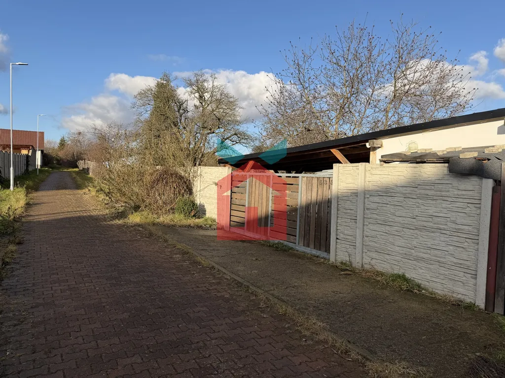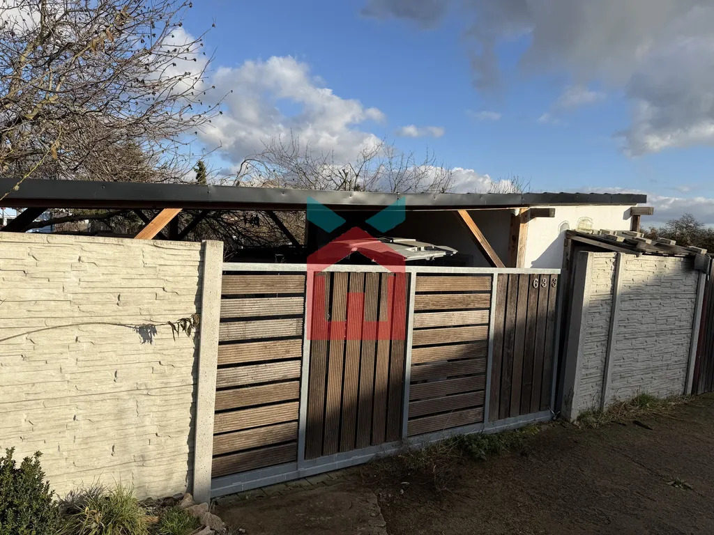 • Přístřešek navazující na dům – dřevěná trámková konstrukce, plechová střecha, vhodný jako zahradní posezení