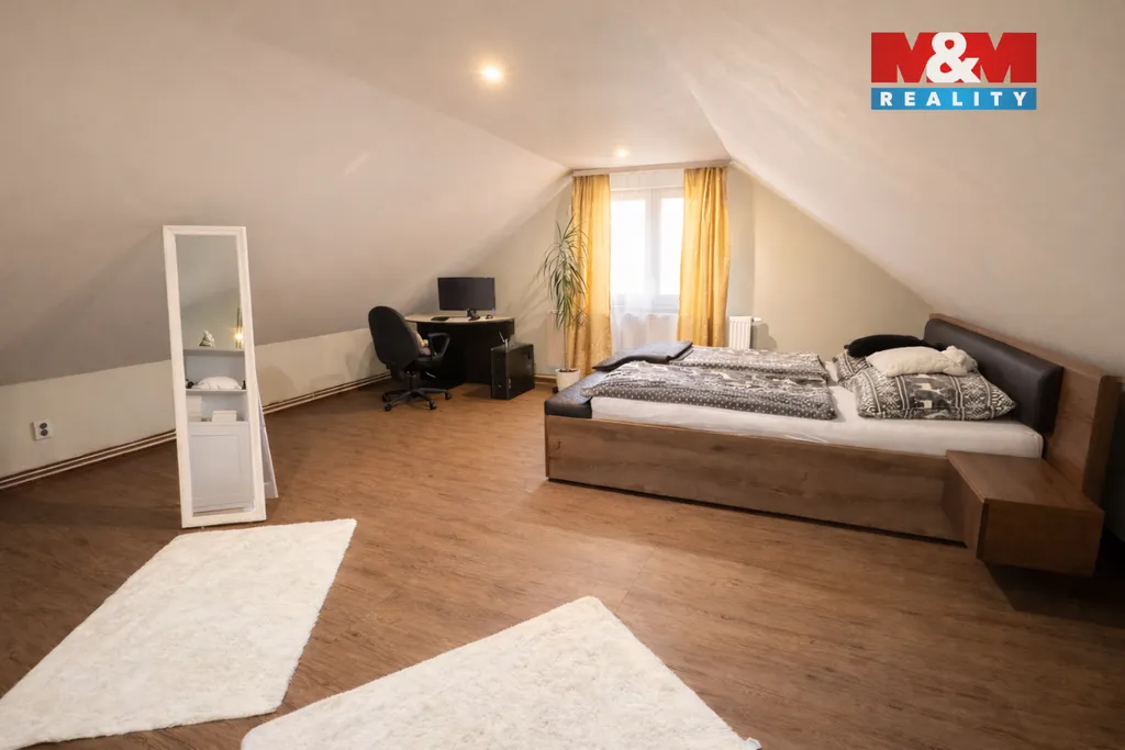 V patře je situována velkorysá hlavní ložnice, doplněná o dvě samostatné šatny, což výrazně zvyšuje komfort každodenního bydlení.