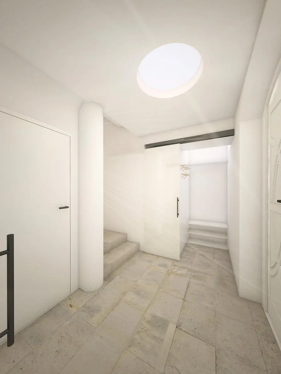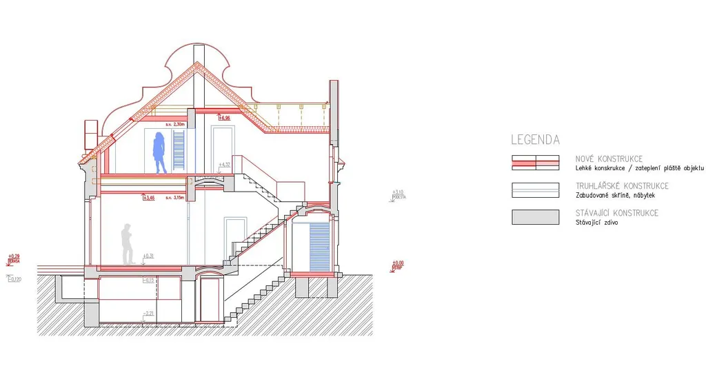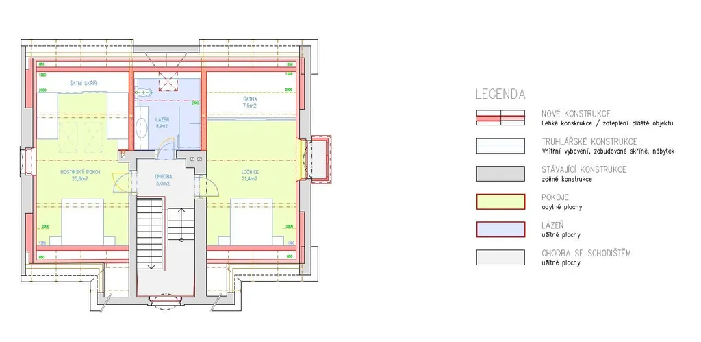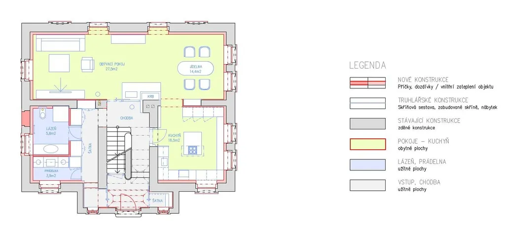 A třeba zrovna Vy máte díky tomu příležitost koupit tento zajímavý dům a ušetřit starosti s administrativou a pustit se do práce. A vytvořit si tak komfortní moderní, ale architektonicky nevšední dům. V rámci stávajícího projektu se mělo jednat o vytvoření vzdušné dispozice 3+1, která obsahuje dvě koupelny, prádelnu, 3 šatny. Navrácení balkónu do 2.NP. Projekt je však možné upravit a dispozici změnit, prostorově by se dalo uvažovat až o 6+1.