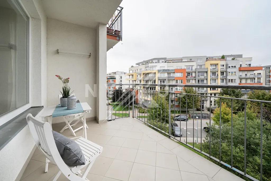 Byt se nachází ve 3. patře domu a jeho dispozice je navržena s ohledem na komfortní bydlení. Z chodby je vstup do komory, koupelny s vanou a toaletou, ložnice a do prostorného obývacího pokoje s kuchyňským koutem, odkud je vstup na slunnou lodžii. Velkou výhodou je sklep umístěný hned na patře vedle bytu, což zajišťuje pohodlný přístup k úložnému prostoru. Součástí bytu je také garážové stání, které je z obou stran chráněno zdí, a poskytuje tak soukromí a bezpečí.