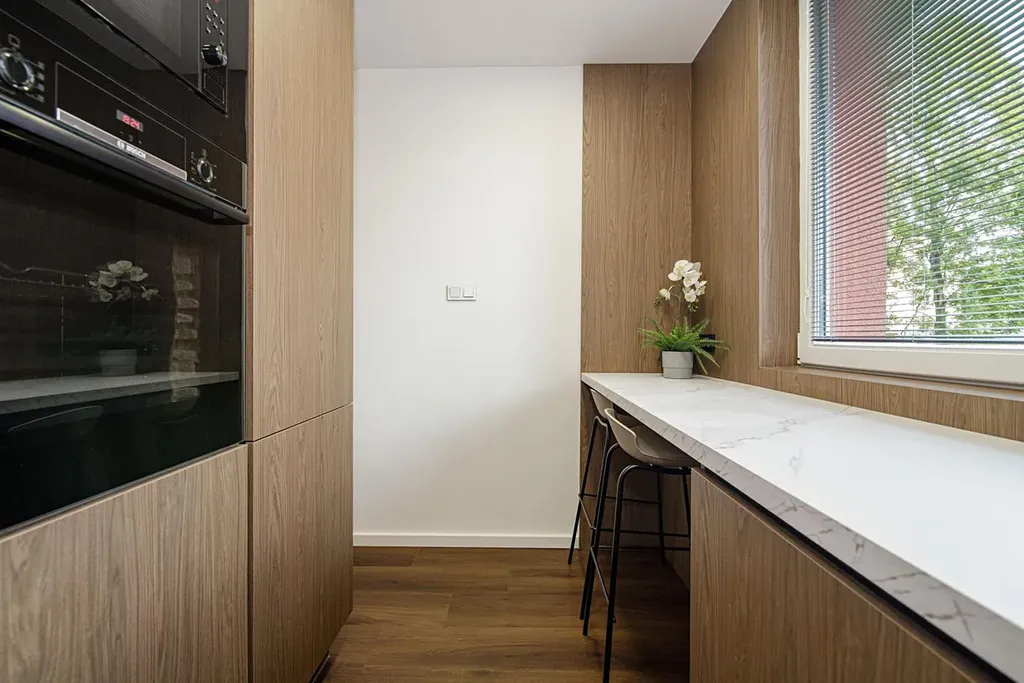 - Kuchyňská linka na míru včetně vestavných spotřebičů: lednice, myčka, digestoř, elektrická trouba, mikrovlná trouba, indukční varná deska, LED podsvícení