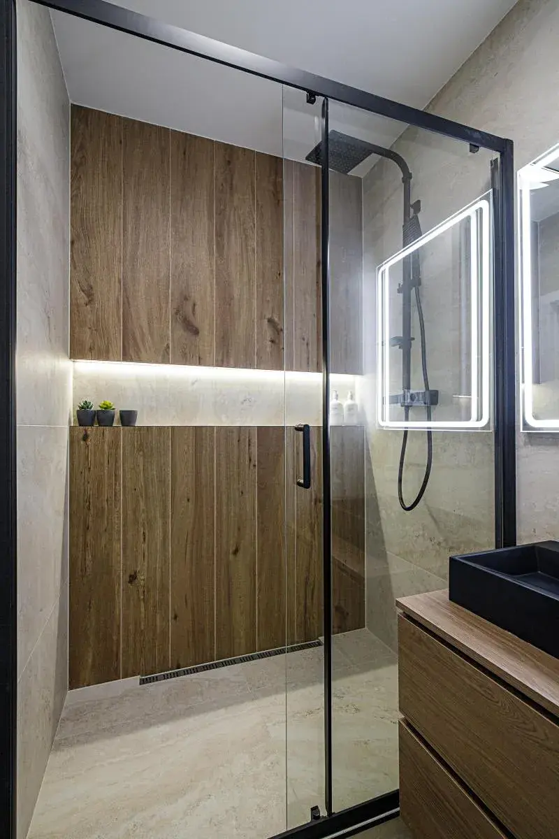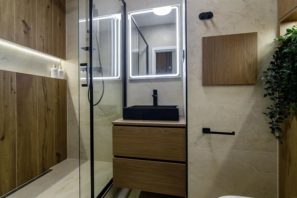 - Koupelna se sprchovým koutem, novými obklady, umyvadlem se skříňkou, podsvíceným zrcadlem a moderními bateriemi