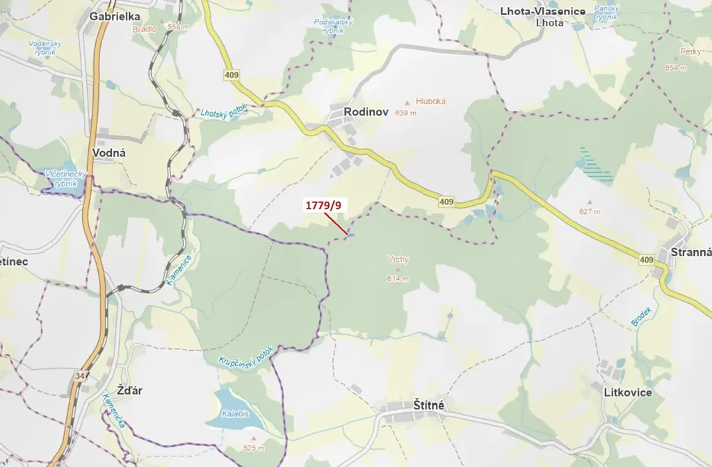 Lesní pozemek o výměře 1388 m2, parcelní číslo 1779/9, podíl 1/1, katastrální území Štítné, obec Žirovnice, obec s rozšířenou působností Pelhřimov, okres Pelhřimov, Kraj Vysočina. Po těžbě.