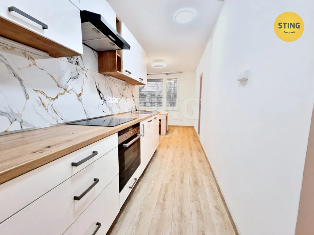 Dispozice bytu nabízí vstupní předsíň, obývací pokoj, kuchyň s prostorným jídelním koutem, jednu ložnici a koupelnu se sprchovým koutem, pračkou, umyvadlem a toaletou. V zádveří bytu se nachází komora, která může sloužit jako praktický úložný prostor nebo náhrada vestavěných skříní. Kuchyň je vybavena moderní kuchyňskou linkou včetně lednice, myčky, elektrické trouby a varné desky.