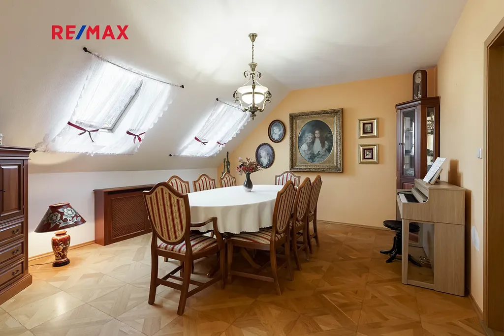 - stylové dřevěné prvky, parkety, lustry a elegantní detaily v celém interiéru
