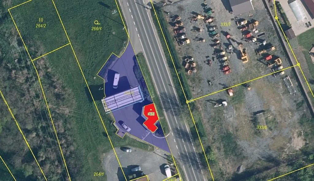 Pozemky nejsou ve vlastnictví prodávajícího a nejsou předmětem prodeje. Je vůči nim zřízeno na Listu vlastnictví věcné břemeno chůze, jízdy a užívání. Prodává se budova s kompletním zázemím. Na pozemky je podepsána dlouhodobá Nájemní smlouva do 31. 12. 2075 s tím, že majitel je ochoten pronajmout další sousedící pozemky vhodné například pro zřízení odstaveného parkoviště, na přístroje foukání a kontroly pneumatik atd.