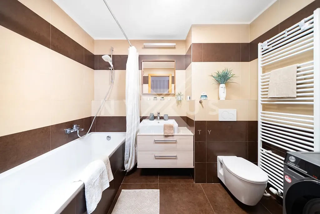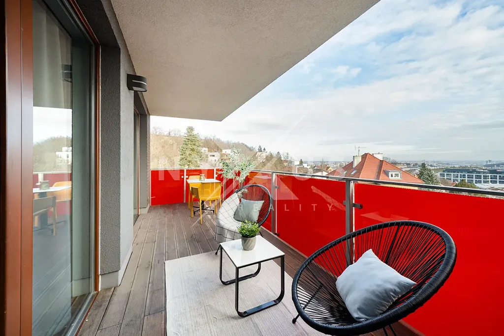Bytová jednotka nabízí dva samostatné pokoje, prostorný obývací pokoj s kuchyňským koutem a přímým vstupem na terasu, koupelnu s vanou a samostatnou toaletu. Vše je v kvalitním provedení a terasa orientovaná na východ poskytuje příjemný výhled na Prahu.