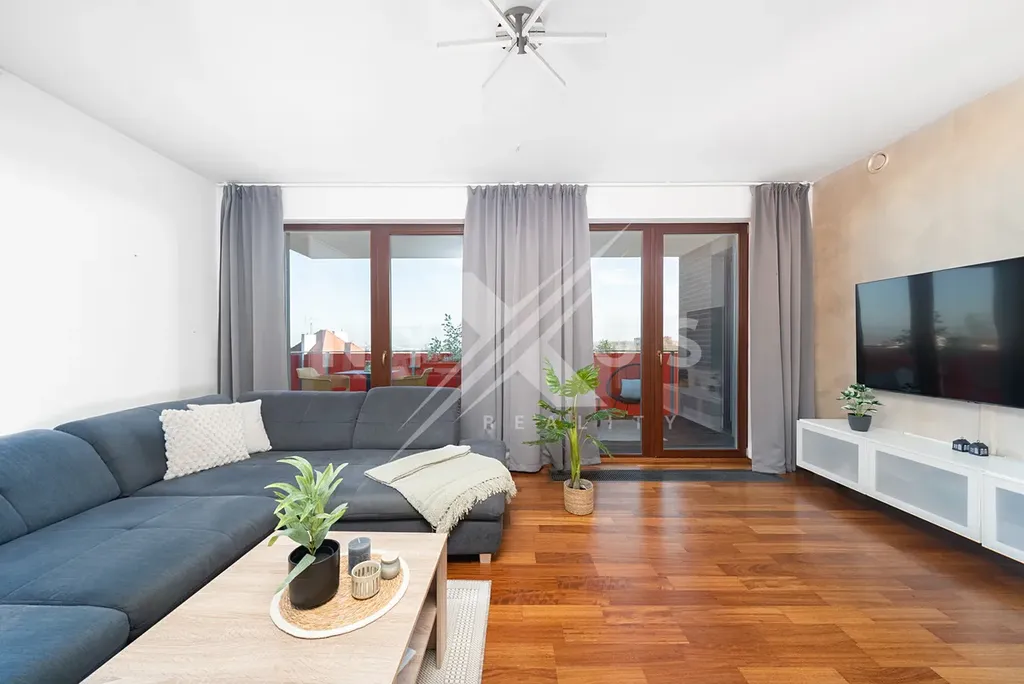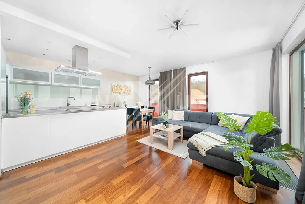 Moderní a velmi světlý byt 3+kk s užitnou plochou 79 m², terasou 12 m² a dvojgaráží 25 m², se nachází ve 3. nadzemním podlaží energeticky úsporného domu v atraktivní lokalitě Na Pomezí, Praha–Jinonice.