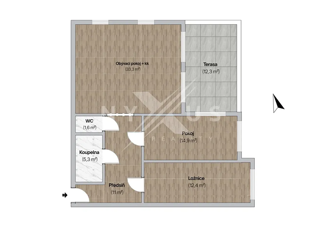 - Obývací pokoj + kuchyňský kout: 33,3 m²