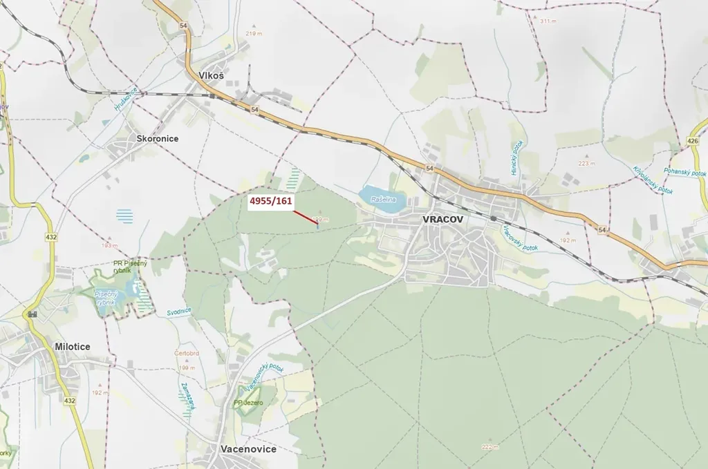 Lesní pozemek o výměře 1702 m2, parcelní číslo 4955/161, podíl 1/1, katastrální území Vracov, obec Vracov, obec s rozšířenou působností Kyjov, okres Hodonín, Jihomoravský kraj.