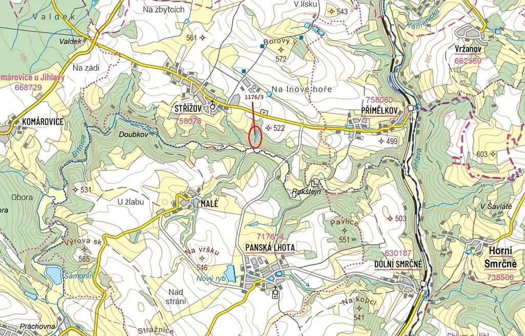 Lesní pozemek o výměře 5146 m2, parcelní číslo 1176/3, podíl 1/1, katastrální území Střížov, obec Brtnice, obec s rozšířenou působností Jihlava, okres Jihlava, Kraj Vysočina. Po těžbě.