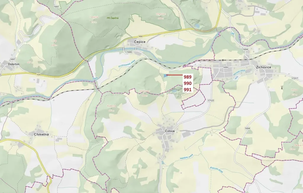 Lesní pozemky o výměře 4 276 m2, parcelní čísla 989, 990, 991, podíl 1/1, katastrální území Čepice, obec Rabí, obec s rozšířenou působností Sušice, okres Klatovy, Plzeňský kraj. Po těžbě.