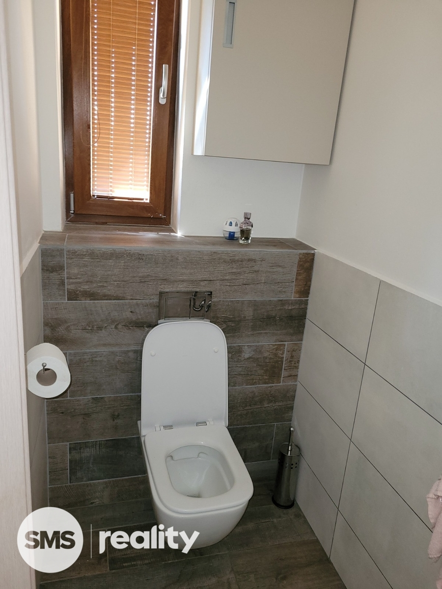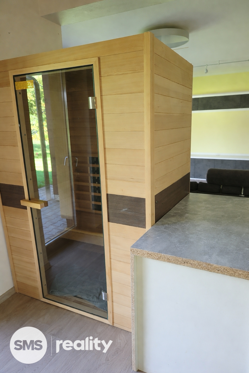 Dům je částečně vybaven. Vnitřní dispozice zahrnuje obývací pokoj s krbem, který navozuje příjemnou atmosféru. Vnitřní součástí je také infra sauna. Nemovitost disponuje dvěma koupelnami - jednou se sprchou a druhou s vanou a WC, navíc je ještě jedno samostatné WC.