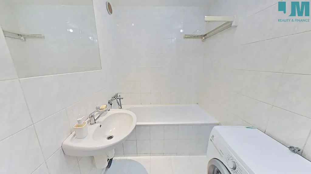 Koupelna je vybavena vanou, umyvadlem, zrcadlem a pračkou, toaleta je samostatná, což zvyšuje komfort bydlení. K bytu náleží také sklep, ideální pro uložení sezónních věcí.