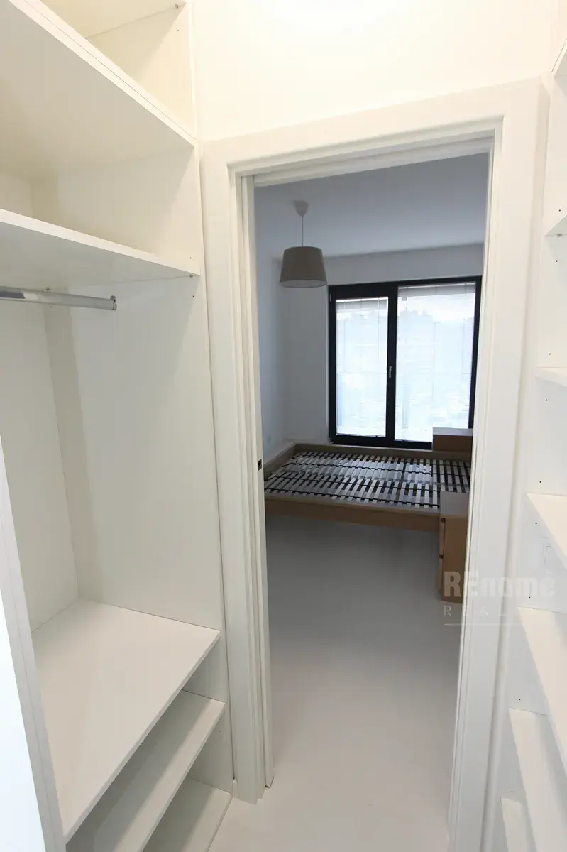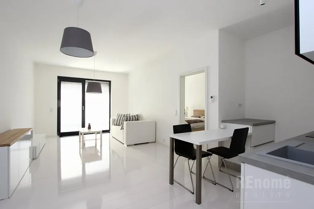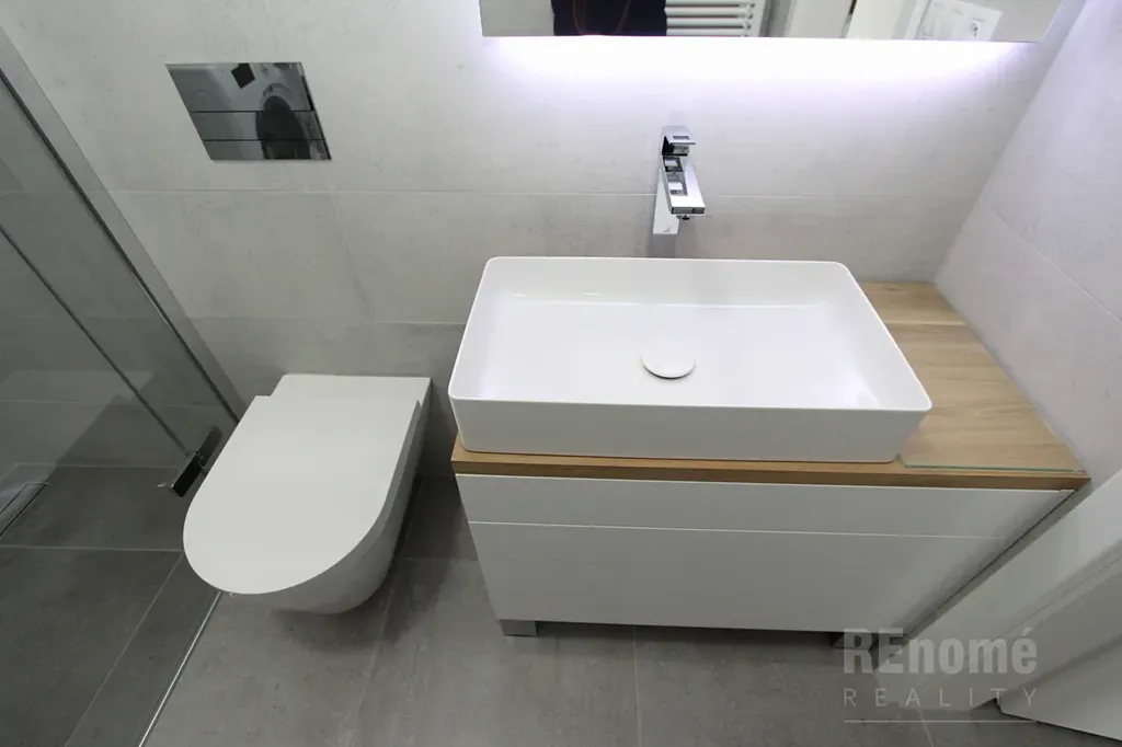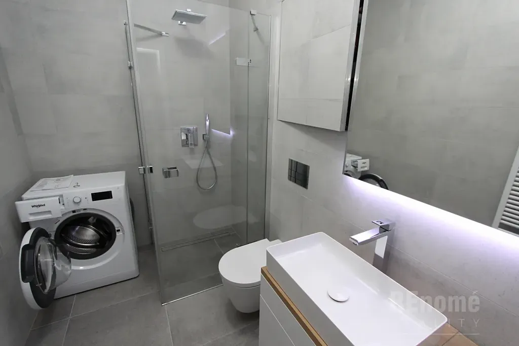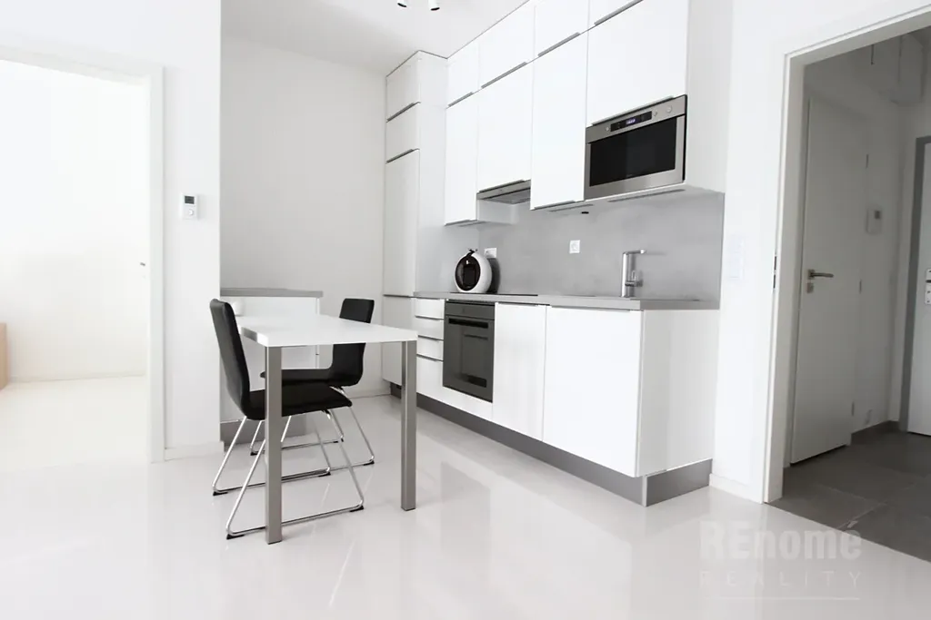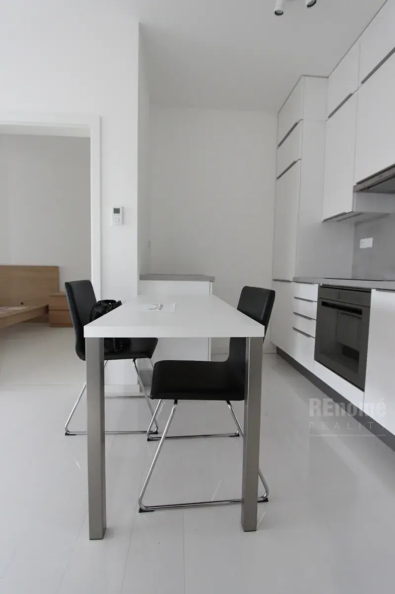 Nabízíme Vám od 1.2.2026 k pronájmu nadstandardně vybavený byt 2+kk (55 m2 s lodžií 10,5 m2 + sklep) v Rezidenci Trinity v Karlíně na nábřeží Vltavy. Byt je umístěn v 6NP a sestává z obývacího pokoje s kuchyňským koutem (30 m2), ložnicí se samostatnou šatnou vybavenou policovým systémem na míru (celkem 17 m2), koupelnou s wc (4,4 m2) a předsíní (4 m2). Byt je díky velkoplošným oknům velice světlý, je orientován na JZ s výhledem na Pražský hrad. Z obou pokojů se vychází na prostornou lodžii (10,5 m2), která se rozkládá po celé šířce bytu. Okna až po zem jsou opatřena venkovními horizontálními žaluziemi v antracitové barvě na dálkové ovládání, vnitřní hliníkové horizontální žaluzie jsou stříbrné. Podlahy jsou, v obývacím pokoji dřevěné - olše s povrchovou úpravou bílý keramický lesk, v ložnici dřevěná podlaha - jasan, v chodbě a koupelně šedá velkoformátová dlažba.