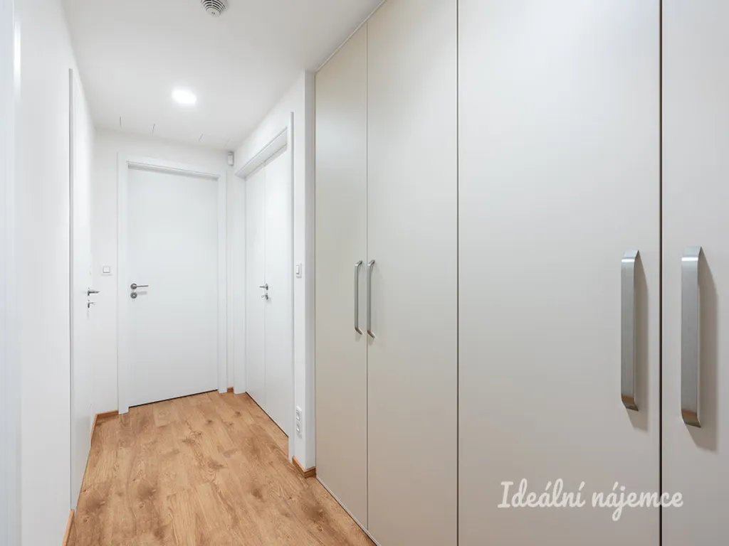 Kuchyně disponuje vestavěnou lednicí, myčkou, indukční varnou deskou, elektrickou troubou a digestoří. V ložnici i předsíni najdeme prostorné vestavěné šatní skříně.