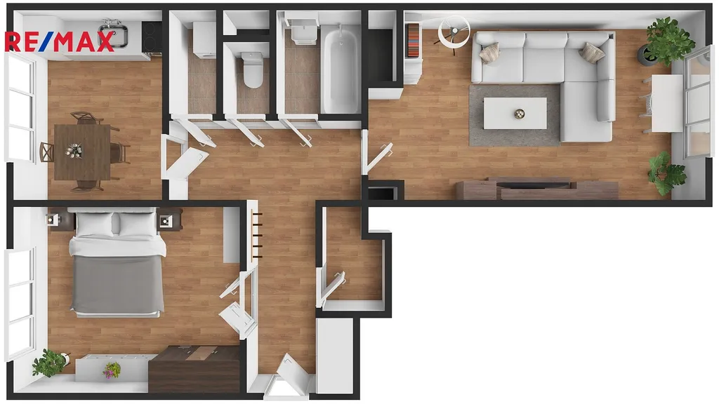Byt se skládá z obývacího pokoje, ložnice, kuchyně, koupelny s vanou a samostatné toalety. Pro dostatek úložného prostoru jsou k dispozici 2 komory - v 1 komoře je napojena pračka, ve 2. komoře jsou police a v předsíni velká vestavěná skříň, což usnadňuje organizaci domácnosti. Kuchyňská linka je vybavena elektrickým sporákem a lednicí. Interiér bytu je čistě vymalovaný a podlahy v obytných místnostech jsou pokryty novým PVC. Byt není zařízen nábytkem.