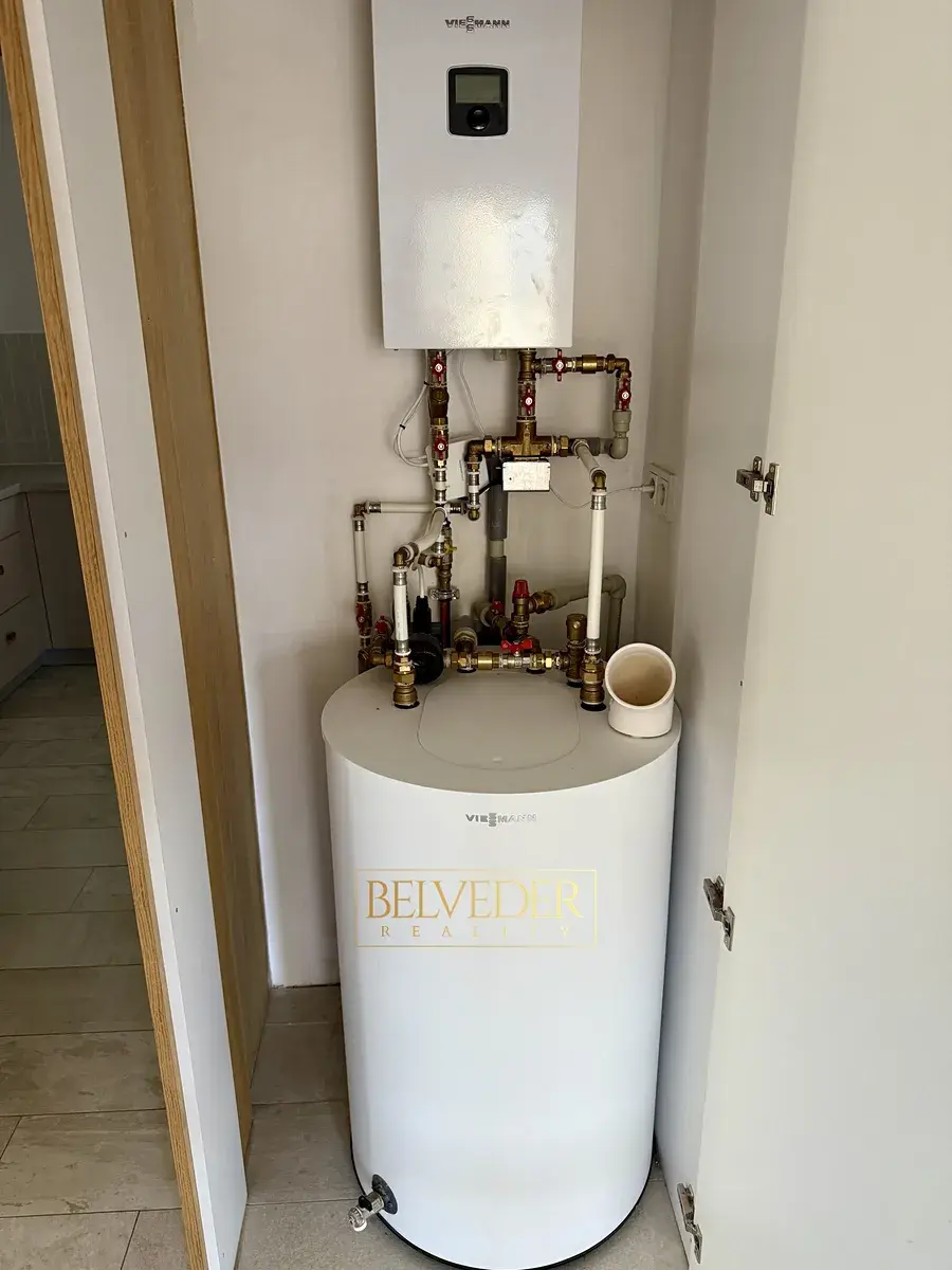 Hlavní obytná část bytu je řešena jako 3+1 (90 m²) a prošla kompletní rekonstrukcí. Byt disponuje parketovými podlahami, dřevěnými okny a moderní koupelnou se sprchovým koutem. Kuchyň je vybavena linkou na míru a vestavěnými spotřebiči. O vytápění se stará vlastní elektrický kotel, což zajišťuje nezávislost a kontrolu nad náklady na energie.