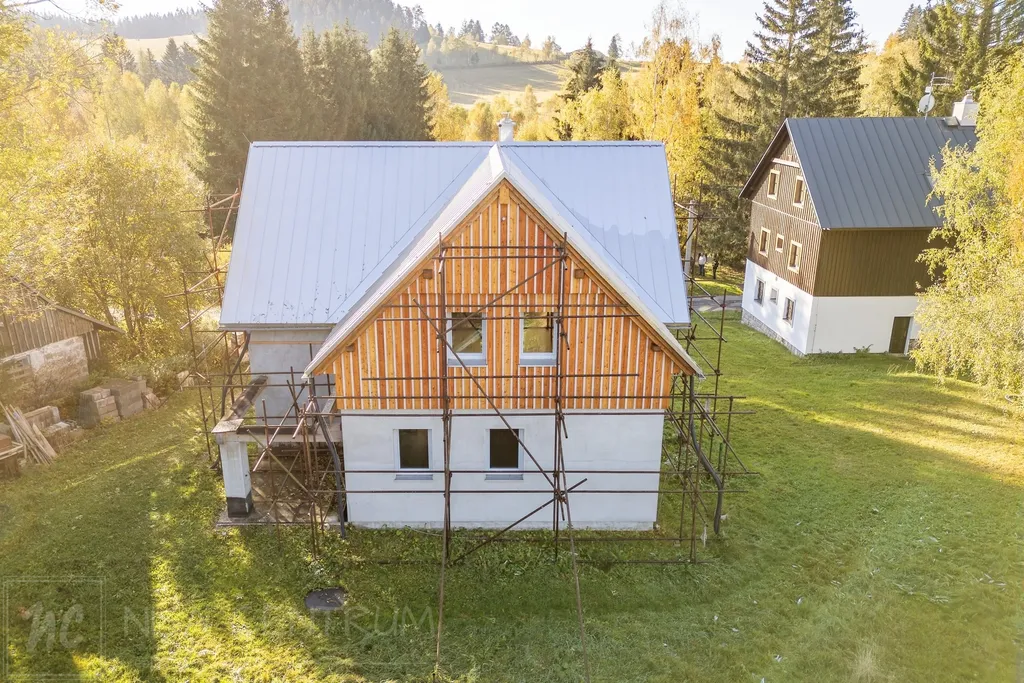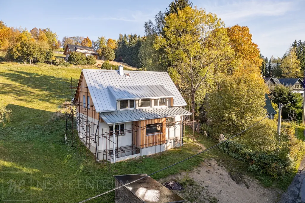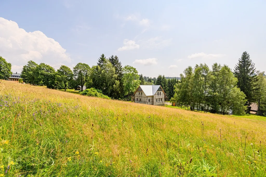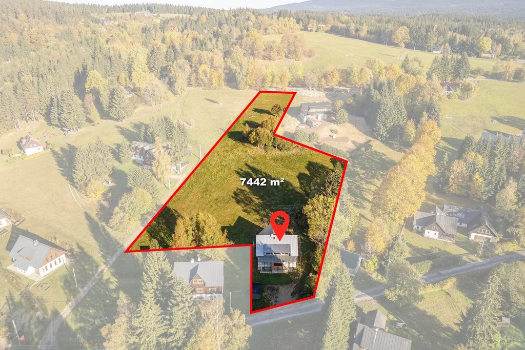 Nabízíme k prodeji pozemek 7442 m² s nízkoenergetickým domem v horské obci Hrabětice u Janova nad Nisou, 3 km od Bedřichova.