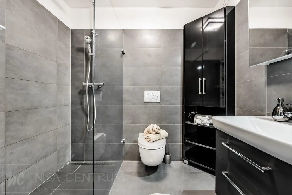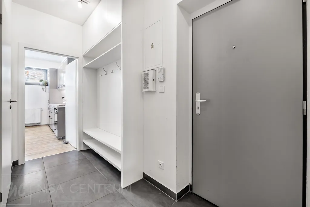 Dispozici plně vybaveného bytu tvoří vzdušný obývací pokoj s kuchyňským koutem a lodžií orientovanou na severozápad, ložnice, koupelna s prostorným sprchovým koutem a toaletou, vstupní chodba a technická místnost.