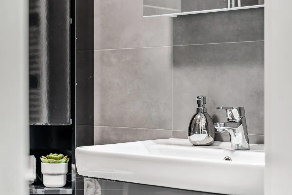 Kuchyňská linka je kompletně vybavena spotřebiči (sklokeramickou varnou deskou, myčkou, lednicí a mikrovlnkou). V koupelně je dostatek místa pro pračku. Bytová jednotka se prodává kompletně zařízená.