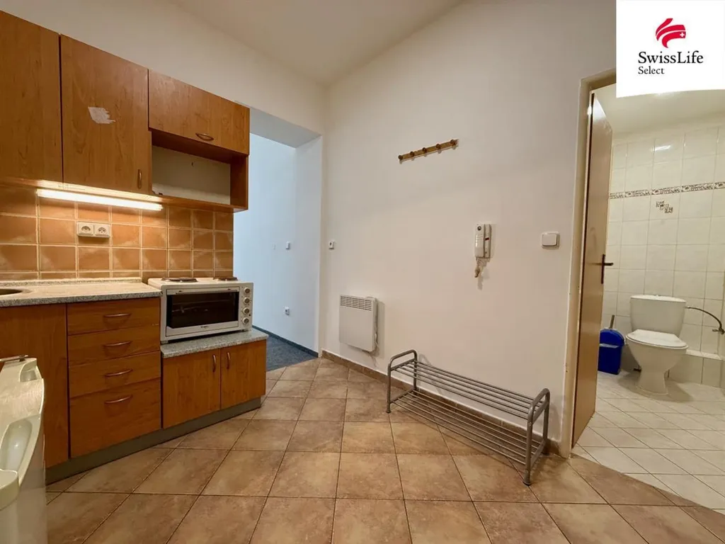 Dispozice bytu: kuchyň, pokoj, koupelna se sprchovým koutem, wc a technická místnost s pračkou. V kuchyni je nová kuchyňská linka se sporákem, která není na fotografiích.