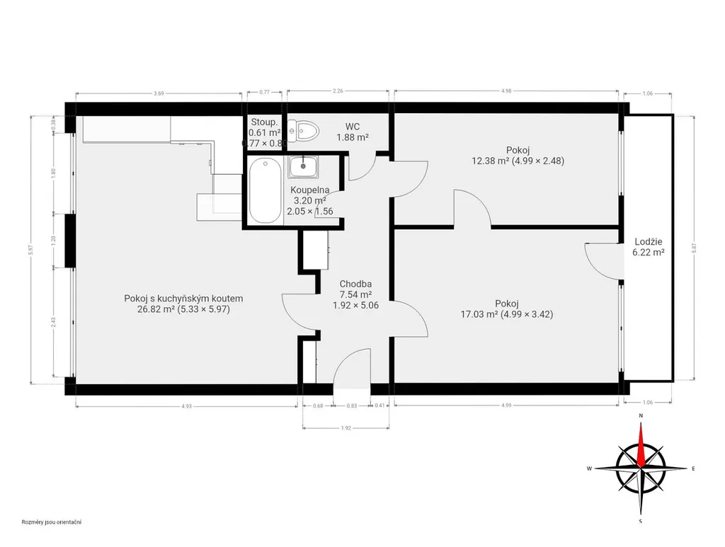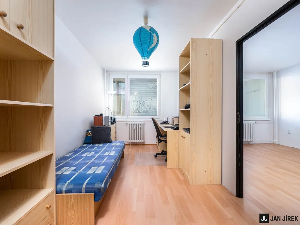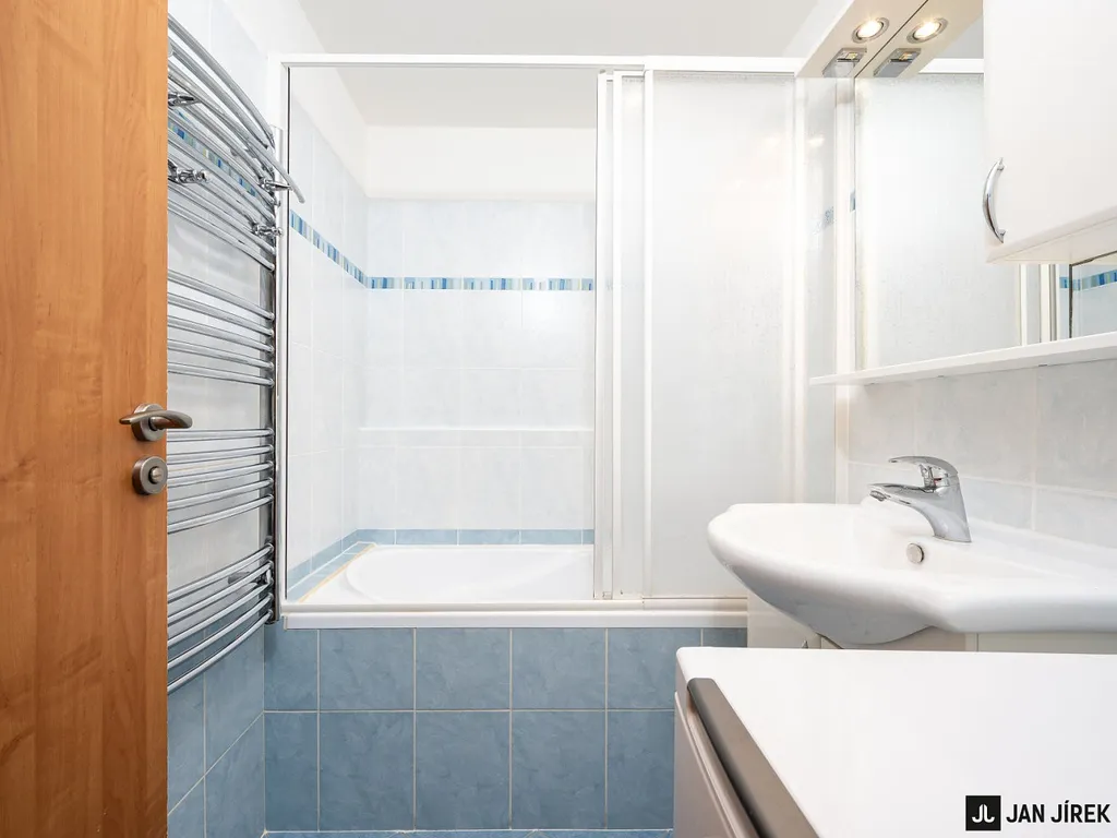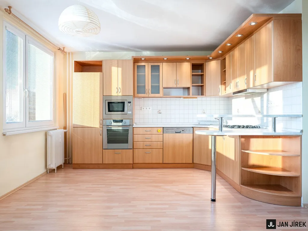 Po levé straně chodby se nachází obývací pokoj s kuchyní na míru, která je vybavena vestavnými spotřebiči (lednice s mrazákem, mikrovlnná trouba, myčka, elektrická trouba, plynová varná deska, digestoř). Po pravé straně chodby najdete dva pokoje, přičemž z jednoho z nich je vstup na prostornou lodžii o ploše 7 m². Na konci chodby se nachází oddělené WC a koupelna s vanou. Byt je zabezpečen bezpečnostními dveřmi.