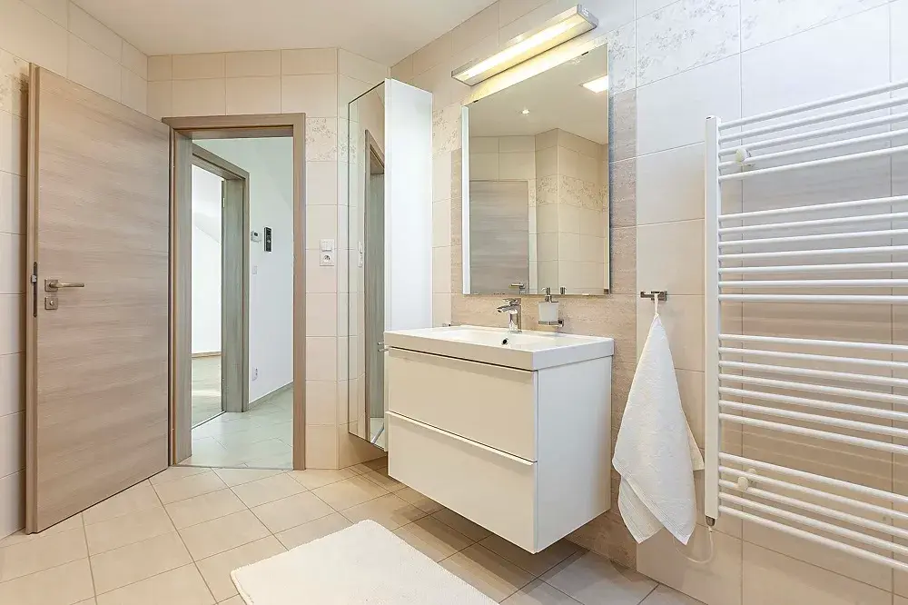 V přízemí domu je nájemci k dispozici vstupní chodba s vestavnou skříní, prostorný obývací pokoj se vstupem na zahradu, plně vybavený kuchyňský kout, jídelna, koupelna se sprchovým koutem, samostatná toaleta, technická místnost. Ve 2.NP jsou pak k dispozici 3 ložnice, koupelna s vanou toaletou a bidetem, šatna.