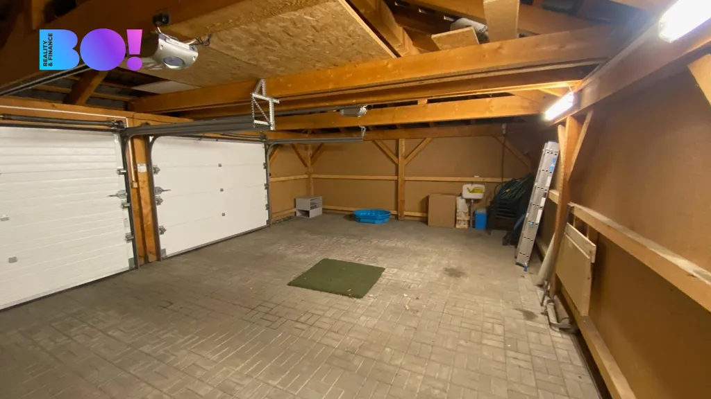 Velkým benefitem je samostatná dvojgaráž s elektrickými vraty na dálkové ovládání, přívodem 380 V, obecní vodou, kamerovým systémem, alarmem a úložnými prostory včetně prostoru pod střechou. Parkování je možné až pro tři vozidla v garáži a další dvě před garáží.