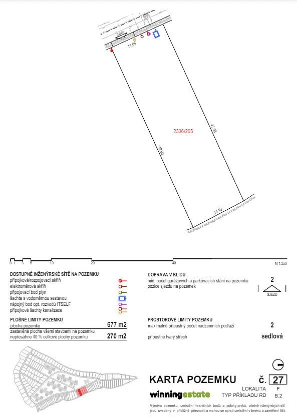 V atraktivní lokalitě Oslavan nabízíme k prodeji stavební pozemek č. 27 (parc. číslo 2336/205) o výměře 677 m². Inženýrské sítě, resp. jejich připojovací body jsou přivedeny na hranici pozemku (kanalizace, voda, elektřina, plyn, optika).