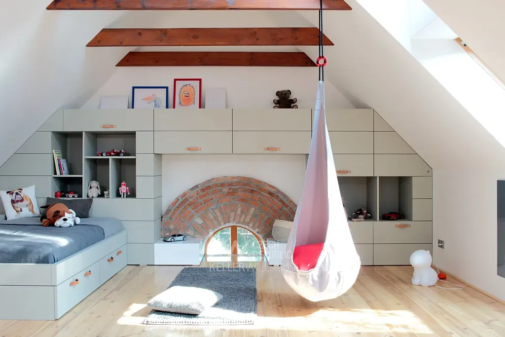 Druhé nadzemní podlaží bylo vybudováno nově v rámci rozsáhlé rekonstrukce, při níž se kompletně obnovila střecha a krovy. Rekonstrukce umožnila otevřít podkroví jako plnohodnotnou obytnou část. Nachází se zde dětský pokoj, hlavní ložnice s navazující lounge místností určenou k odpočinku, prostorná šatna a elegantní koupelna s antracitovou betonovou stěrkou a kamennou mozaikou. Atmosféru horního patra doplňují dřevěné trámy a originálně řešené prvky nábytku na míru, které využívají každý centimetr prostoru.