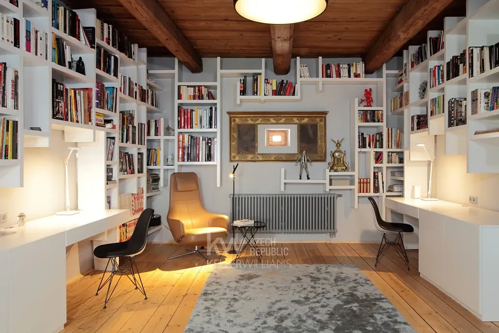 V přízemí se dále nachází stylová pracovna s knihovnou řešenou na míru. Koupelna s volně stojící vanou a cihlovým sprchovým koutem kombinuje dobové prvky s moderními materiály a působí jako nadčasové spojení řemeslné historie a současného designu. Součástí přízemí je také útulná ložnice pro hosty.