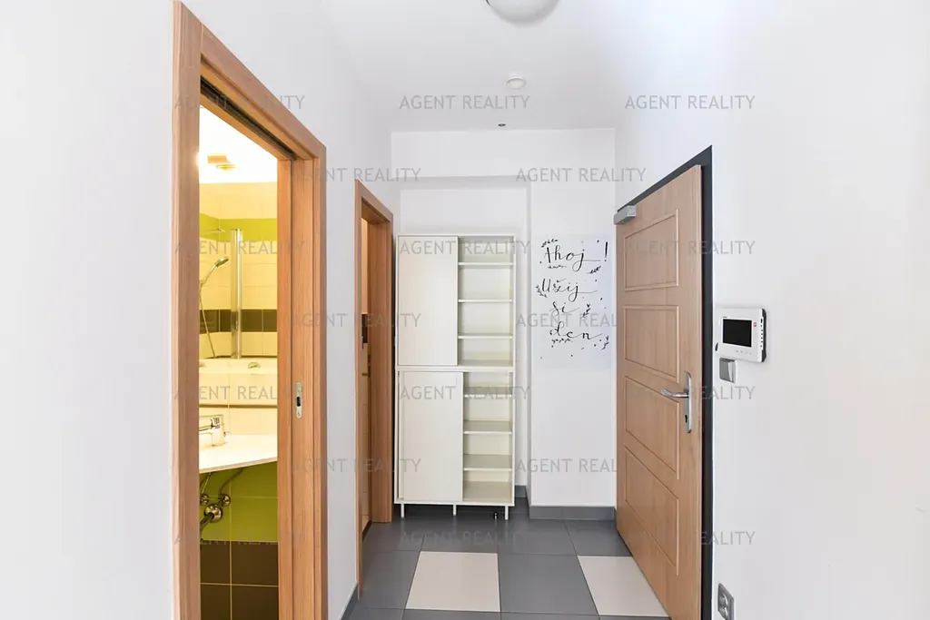 Byt se nacházá ve 2NP a je pronajímán nezařízený. Vstupní chodba a předsín, prostorný obývací pokoj s kuchyňským koutem vybaveným kvalitními spotřebiči (el. trouba, sklokeramická deska, kombinovaná lednice, mikrovlnná trouba).