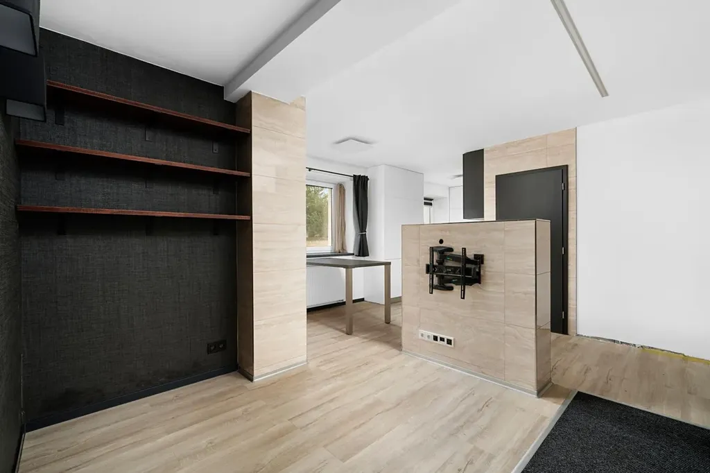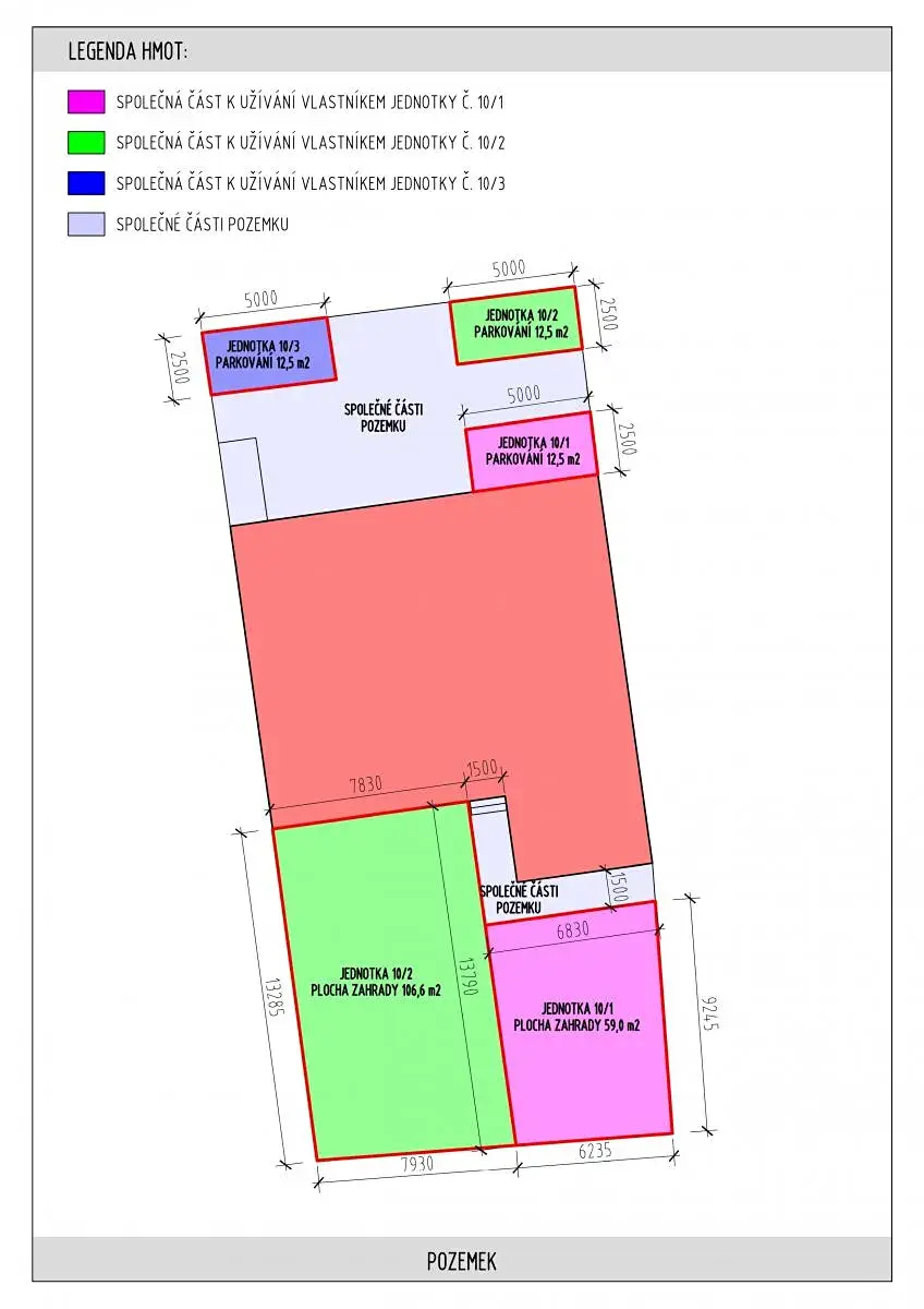 byt s dispozicí 2+kk (101 m2) s garáží (20m2), parkovacím stáním (12 m2) a zahradou (107 m2) se rovněž nachází v 1. nadzemním podlaží