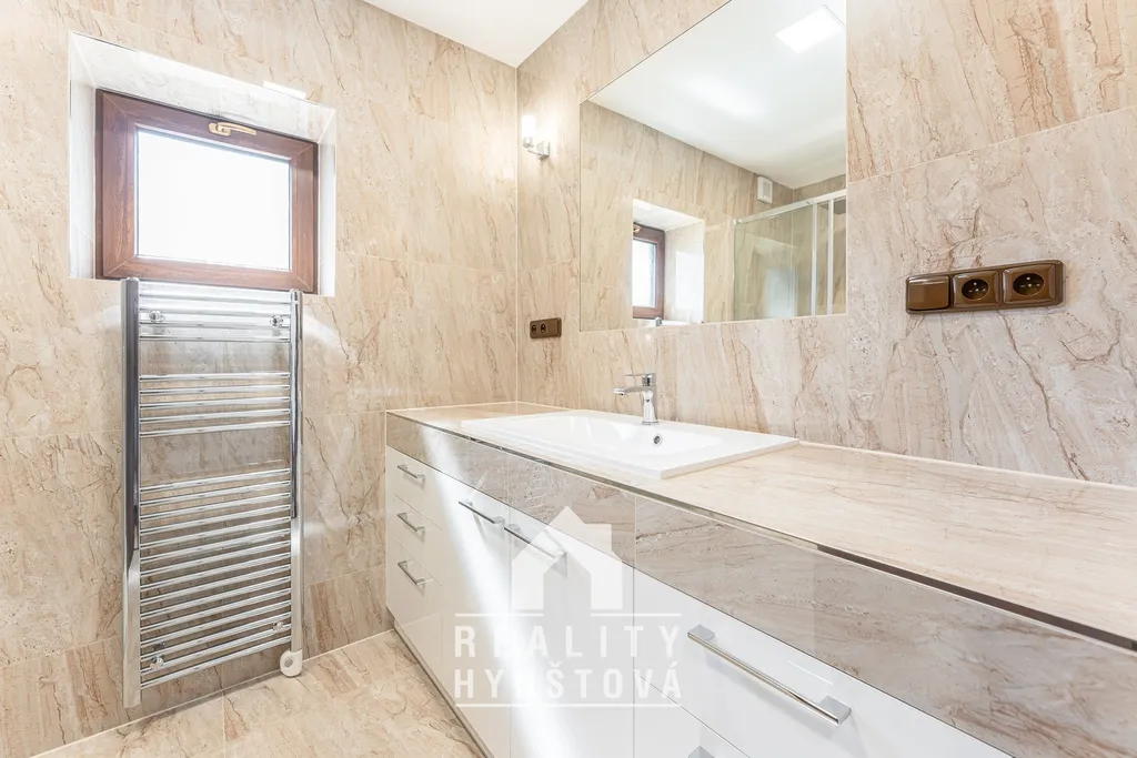 V koupelně vás zaujme velký sprchový kout s osmimilimetrovým bezpečnostním sklem. Na vaničce i umyvadle je použitý litý mramor.