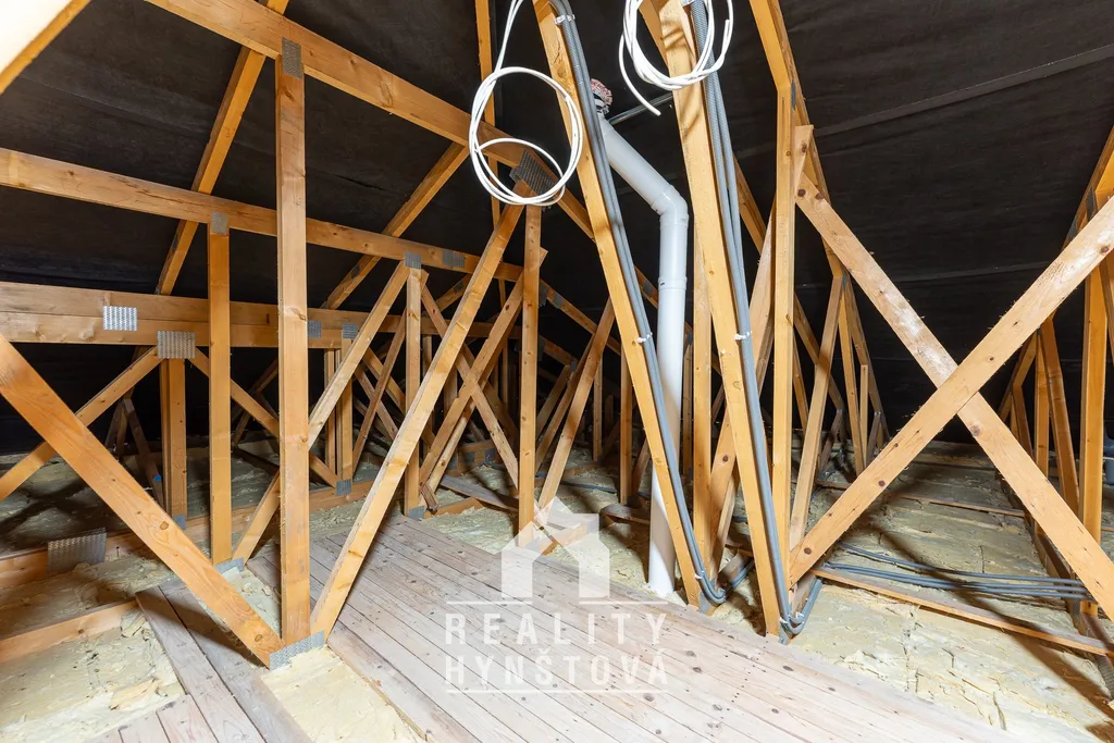 Vstup na půdu je možný z garáže a je zajištěn stahovacími dřevěnými schody