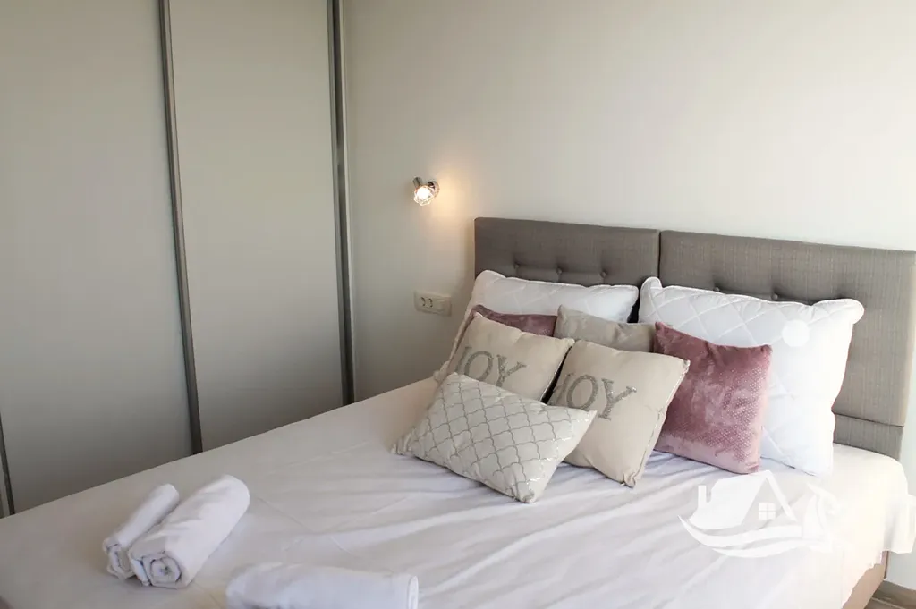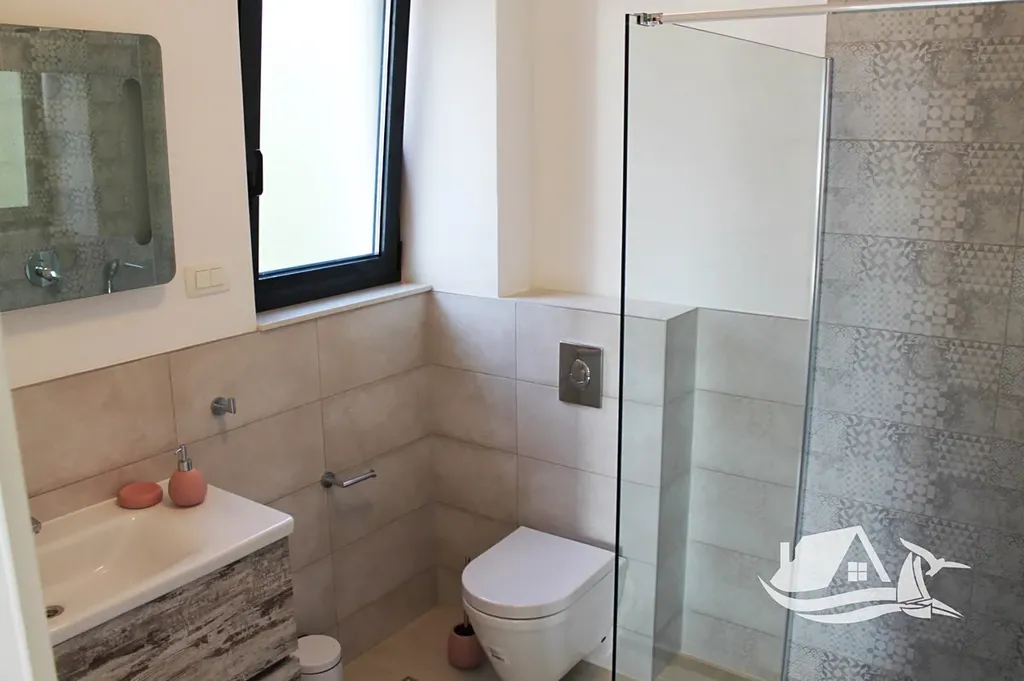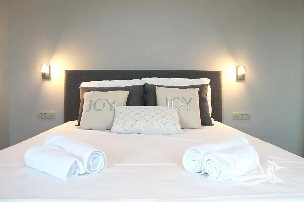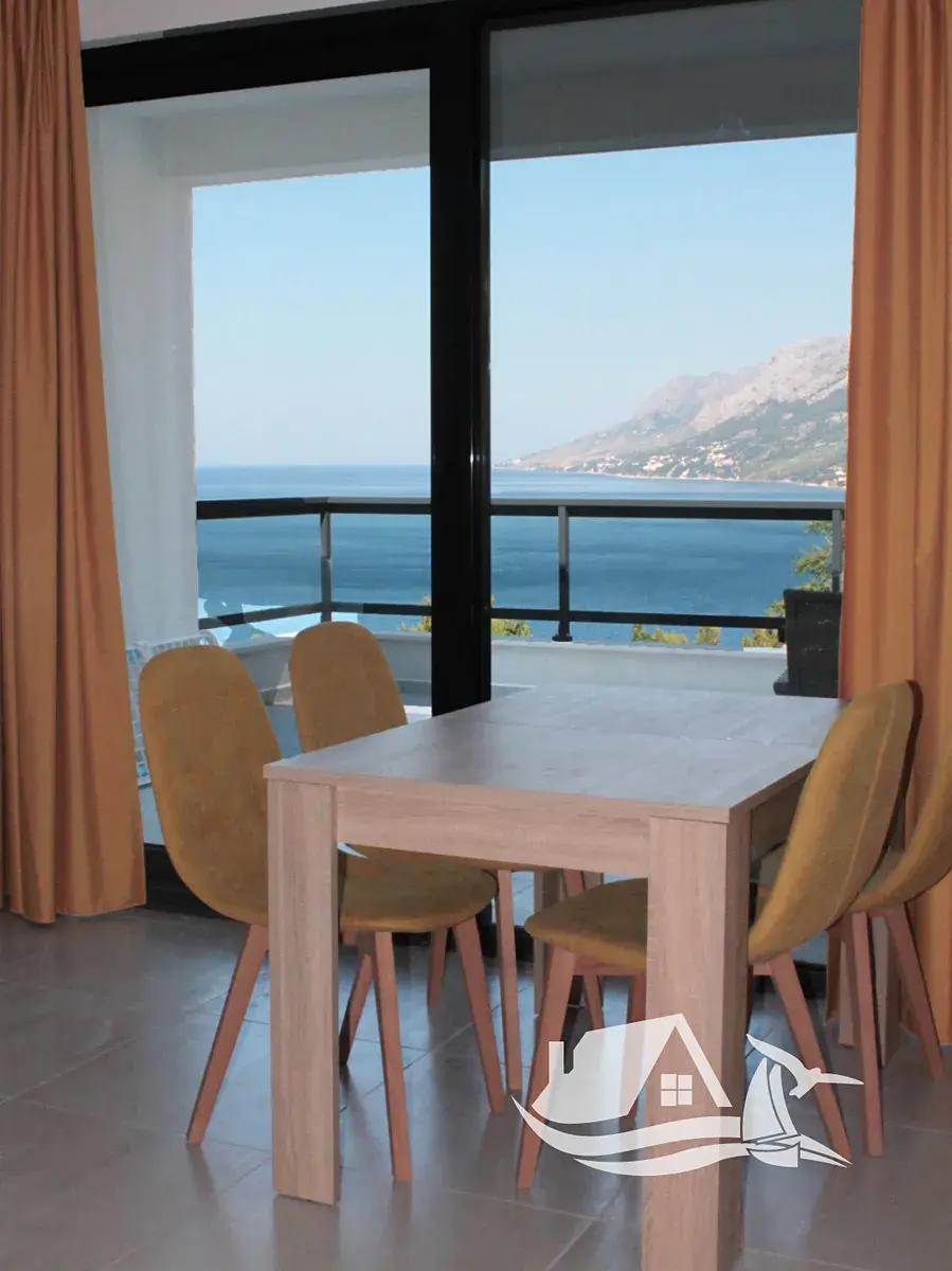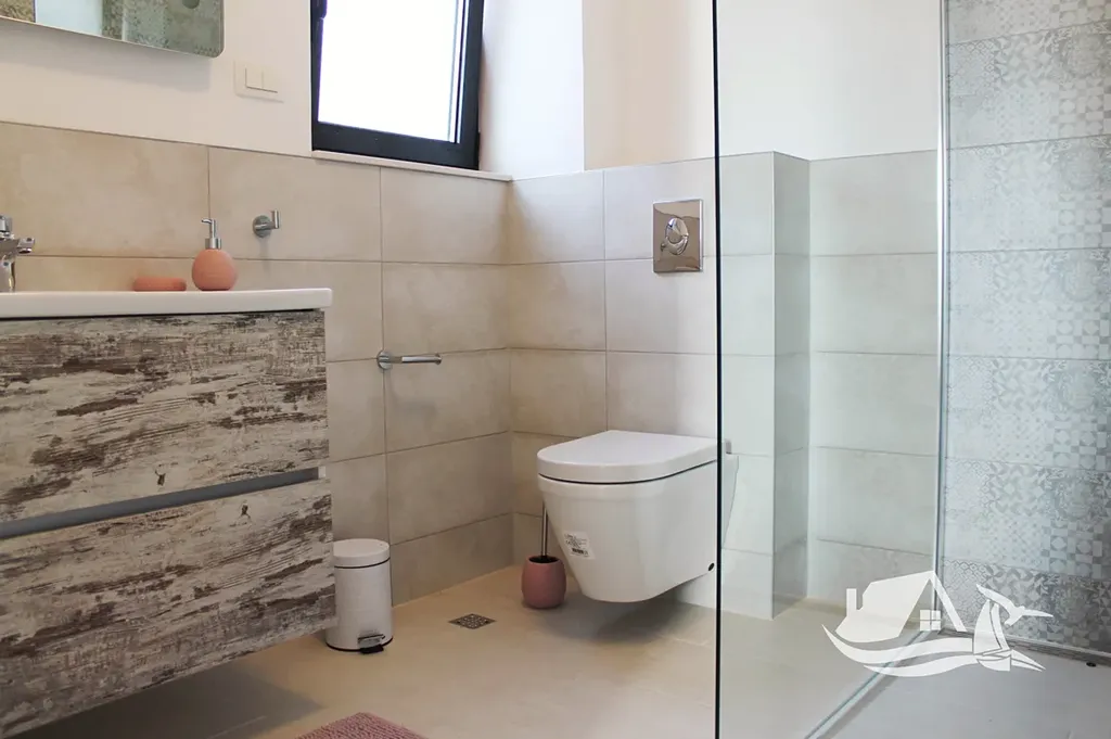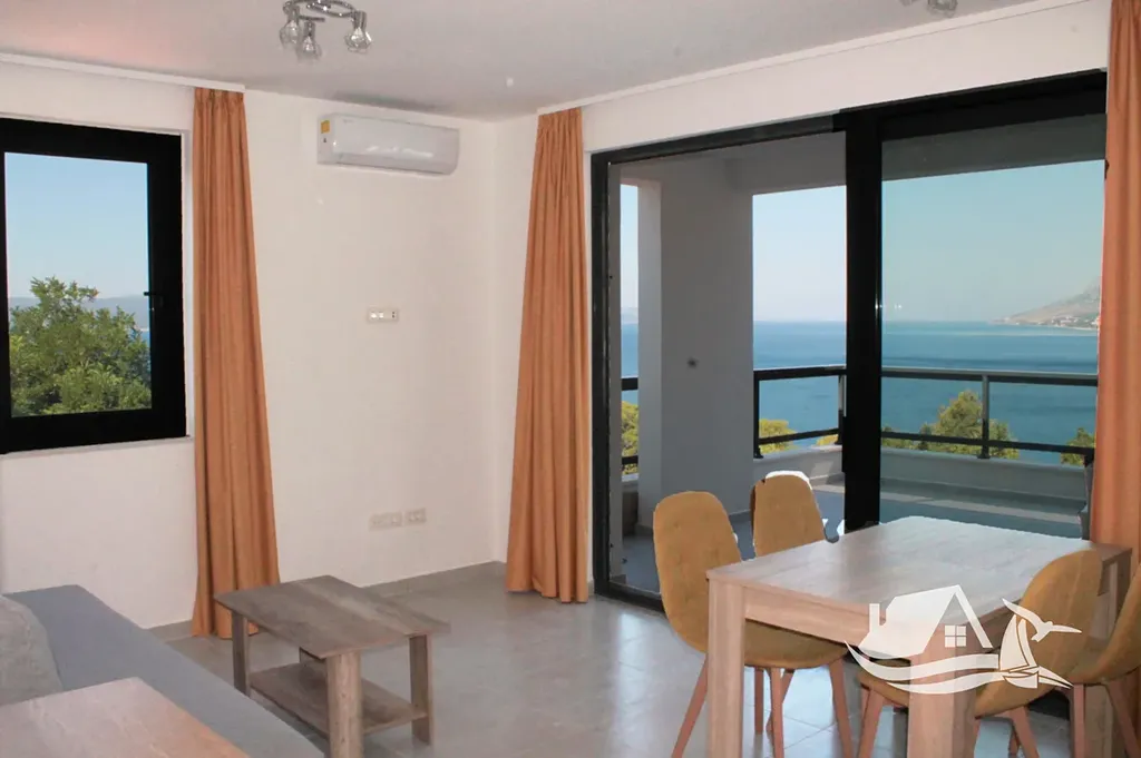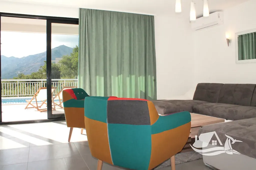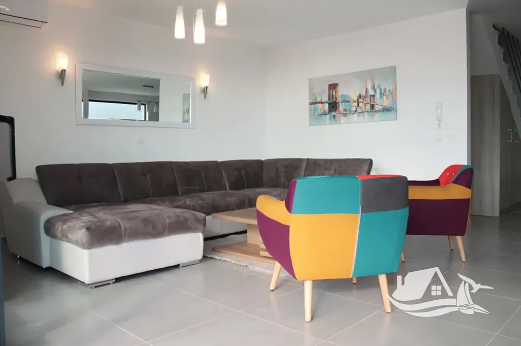 V přízemí a prvním patře se rozkládá hlavní mezonetový byt o ploše 212 m². Vstupní úroveň zahrnuje prostorný obývací pokoj propojený s jídelnou a kuchyní, toaletu pro hosty a přímý vstup na terasu s bazénem o velikosti cca 30 m². Sluneční terasa kolem bazénu nabízí ideální prostor pro odpočinek s výhledem na moře a okolní ostrovy. V horním patře tohoto bytu se nacházejí tři prostorné ložnice, každá s vlastní koupelnou, a balkon o ploše 15 m² s panoramatickým výhledem.