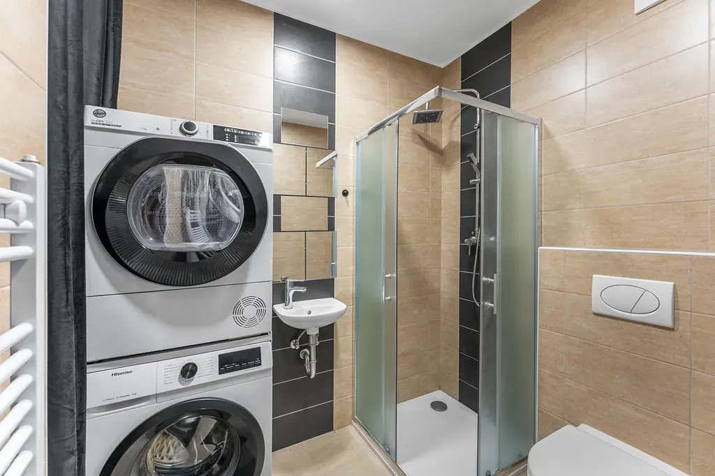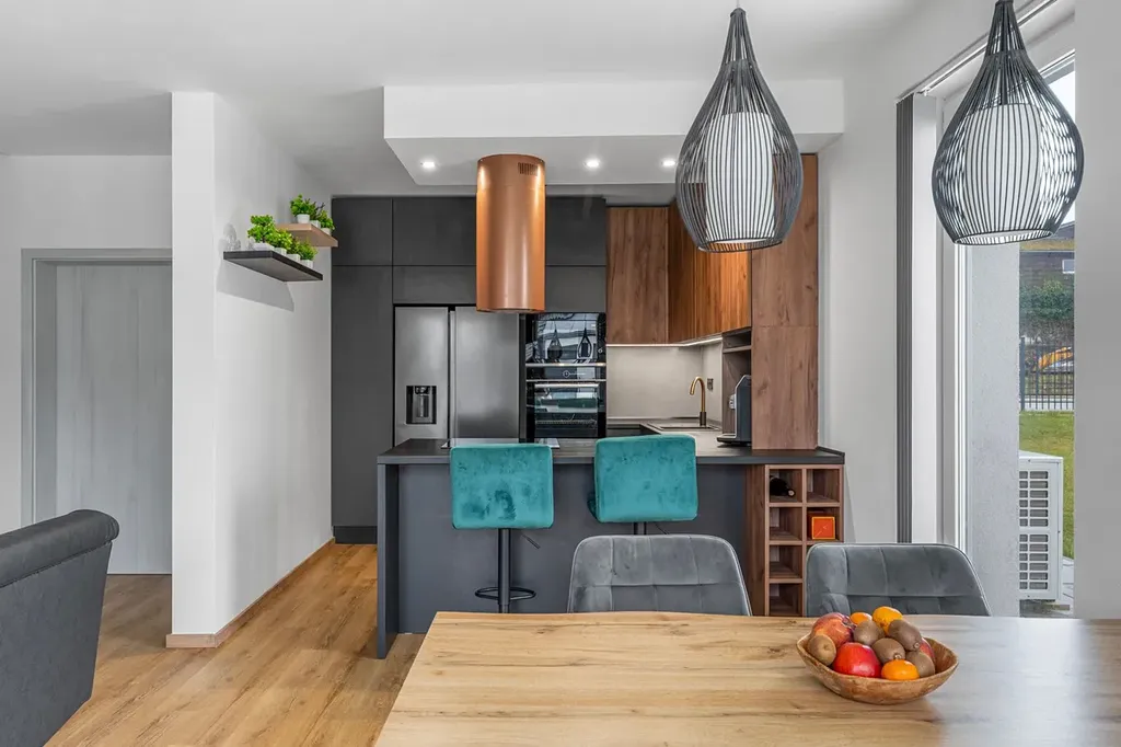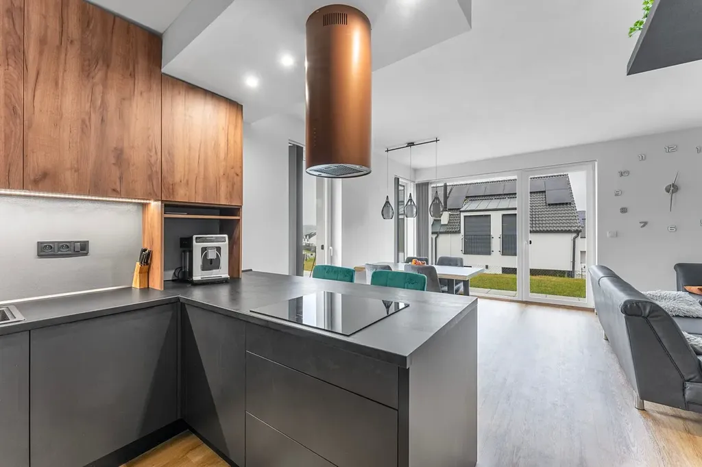 Kuchyň: Indukční varná deska, elektrická trouba, vestavěná lednice, vestavěný mrazák, mikrovlnná trouba, komínová digestoř, myčka nádobí.