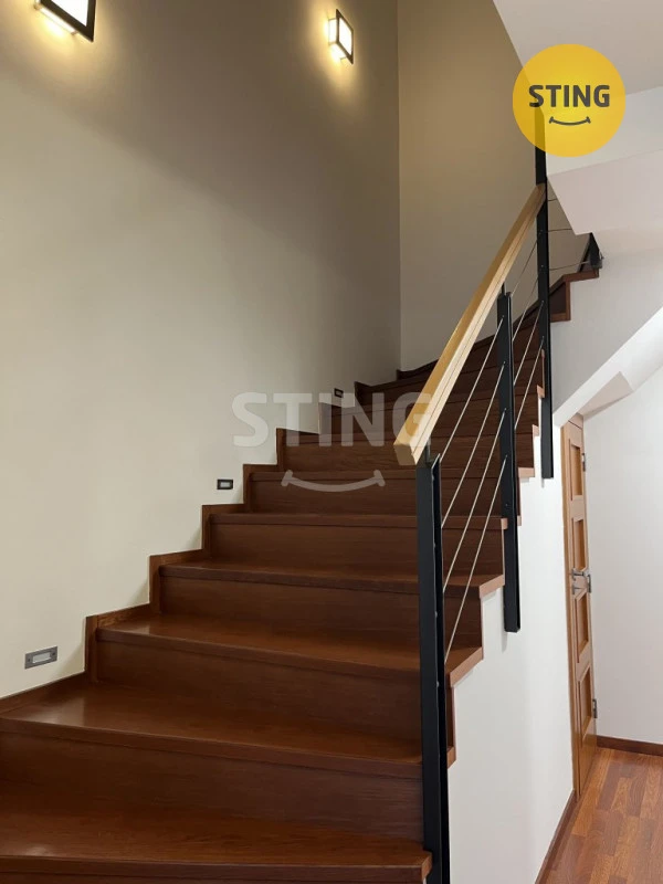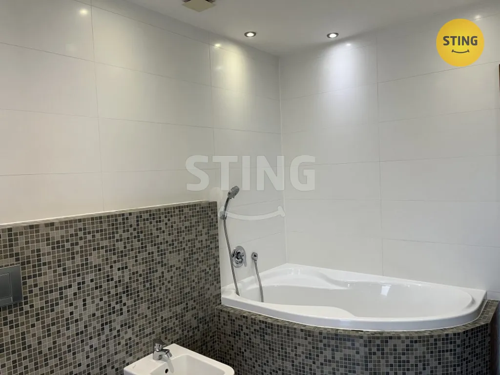 V přízemí se nachází obývací pokoj s otevřenou kuchyní, jedna stěna je prosklená HS portálem, který tvoří výstup na prostornou terasu a do zahrady, dále šatna, toaleta, spíž a technické zázemí. Kuchyň je vybavena kuchyňskou linkou s vestavěnými spotřebiči. V patře je ložnice a dva samostatné pokoje, šatní místnost, technický prostor vybaven pračkou a sušičkou, koupelna se sprchovým koutem i vanou. V celém domě je položena plovoucí podlaha. Dům je vytápěn v přízemí podlahovým topením, velkou výhodou tepelné čeradlo a fotovoltaika, což významně zvyšuje energetickou úspornost prvovozu tohoto luxusního domu. Dům stojí v lukrativní lokalitě, dostupnost do centra města pět minut. Kauce 126.000,-Kč.