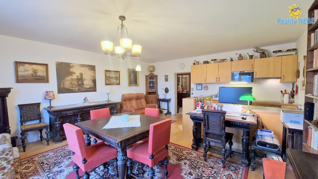 Byt se nachází v prvním patře s pěkným výhledem na Uhříněveský kostel. Skládá se z prostorného obývacího pokoje s kuchyňským koutem (32 m2), ložnice (19 m2), předsíně (5 m2), koupelny (5 m2), balkonu (5 m2) a sklepu (5 m2). Kuchyňská linka je s vestavěnými spotřebiči, elektrickou troubou, mikrovlnnou troubou a myčkou na nádobí. Ložnice je orientovaná na východ, obývací pokoj s balkonem na západ. V obou místnostech je velké třídílné francouzské okno.