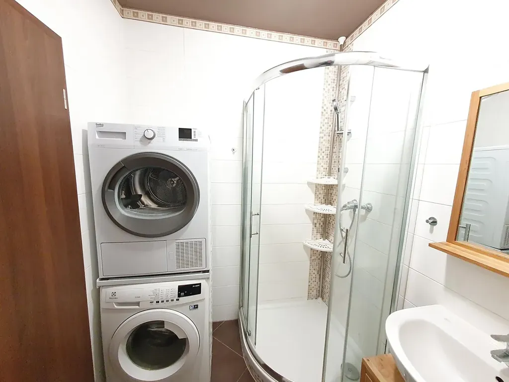 pokoj s moderní plně vybavenou kuchyňskou linkou se vstupem na terasu a zahradu, předsíň, prostorná komora, velká koupelna se sprchovým koutem a toaletou. Garážové stání a prostorný sklep.