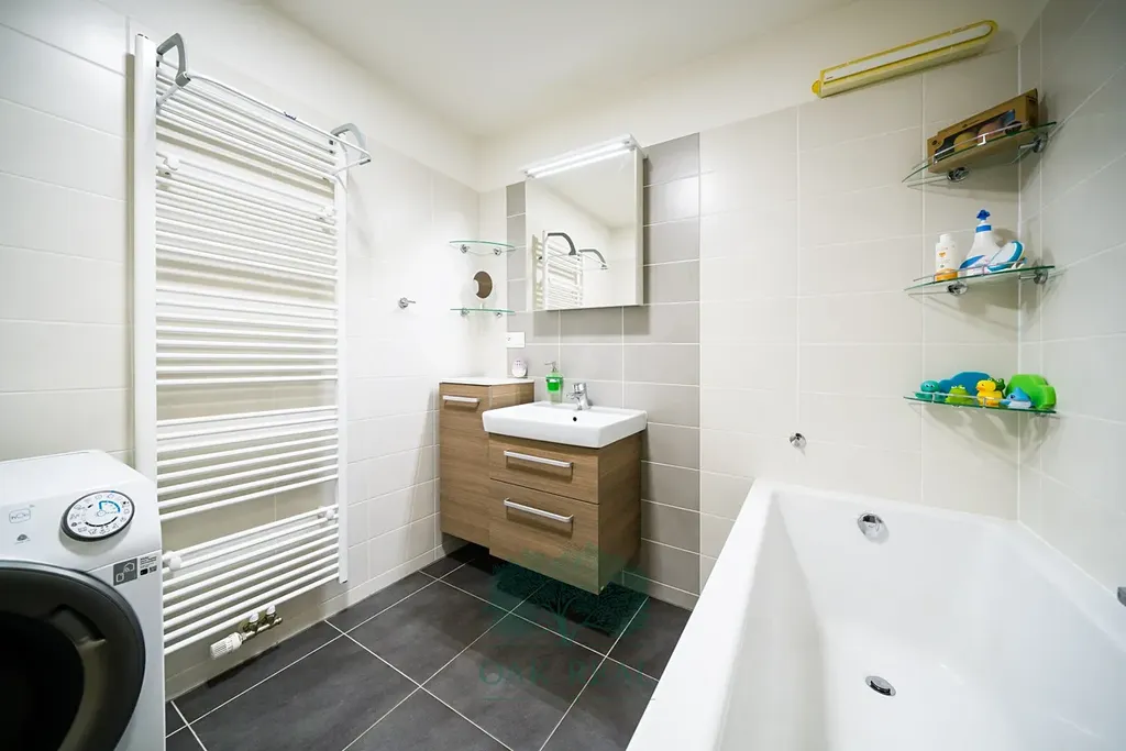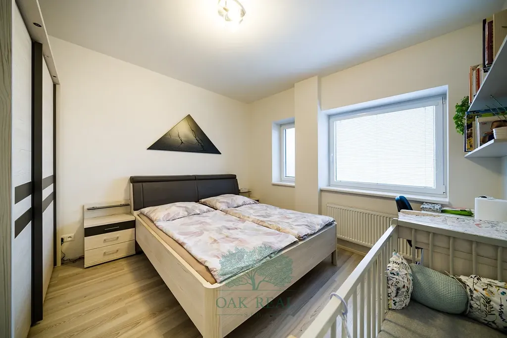 Dále je v bytě k dispozici ložnice s velkou vestavěnou skříní. Vedle ložnice se nachází koupelna vybavená vanou a prostorem pro pračku. Samostatná toaleta je dostatečně prostorná. Ve vstupní chodbě je vestavěný botník, na který navazuje samostatná šatna s další vestavěnou skříní. V případě zájmu je možné nábytek po dohodě s majitelem odkoupit za zlomek původní ceny. Okna jsou plastová pětikomorová a na podlaze je dlažba a vinylová podlaha s dekorem dřeva.