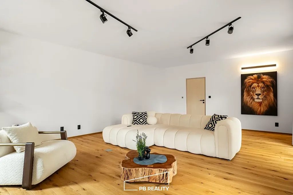 Dřevěná podlaha, podsvícená kuchyňská linka včetně spotřebičů v minimální hodnotě 300 000,-Kč s italskou stěrkou Travertino Romano, prostorná koupelna též kompletně v italské stěrce Travertino Romano s vanou a walk – in sprchou, na zakázku šité black-out závěsy v celém bytě, podsvícená skleněná příčka a zakázková skříňová sestava.