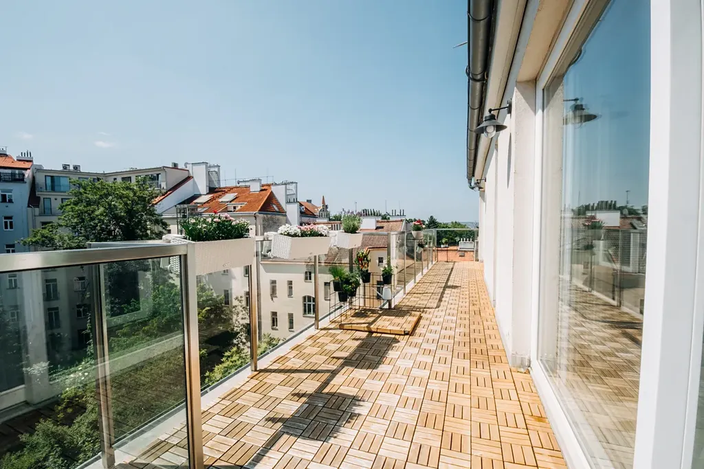 Nabízíme k prodeji výjimečný mezonetový byt 2+kk o podlahové ploše 100 m² s terasou 20 m², situovaný v posledním patře cihlového domu s výtahem v klidné části Prahy 3 – Bořivojova / Rajská zahrada, v těsné blízkosti Riegrových sadů. Byt poskytuje naprosté soukromí, klid a dechberoucí výhled na Pražský hrad i do zeleného vnitrobloku. Díky umístění v nejvyšším podlaží není třeba dělit se o terasu ani patro se sousedy, což zajišťuje maximální míru soukromí, kterou u většiny novostaveb dnes již nenajdete.