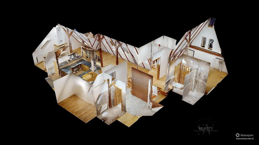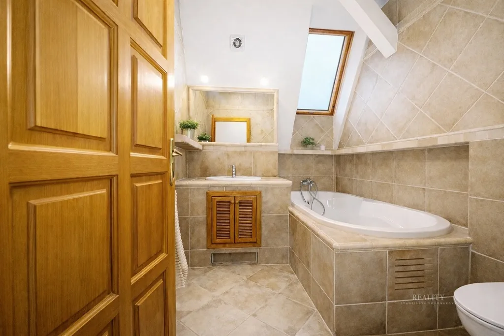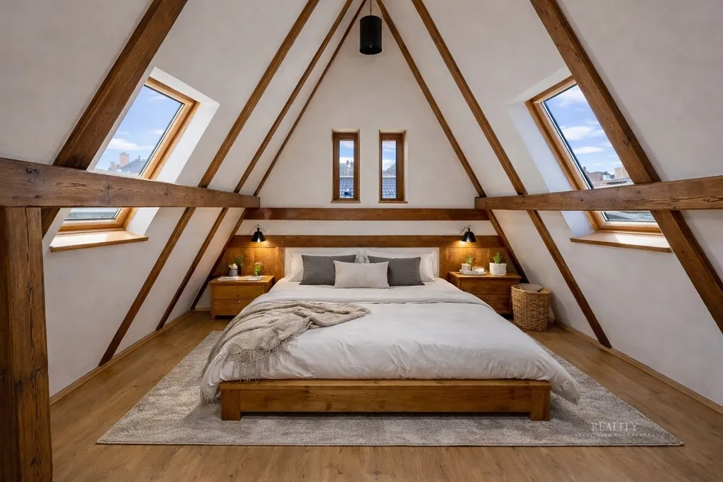Velkorysý podkrovní obývací prostor s krbem, kuchyňským koutem, přiznanými historickými trámy a přímým vstupem na terasu. Krb zde tvoří výraznou dominantu interiéru a zároveň plní funkci doplňkového zdroje tepla.