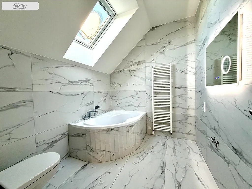 Hlavní ložnice s vlastní koupelnou (vana i sprchový kout) a navazující dámskou a pánskou šatnou