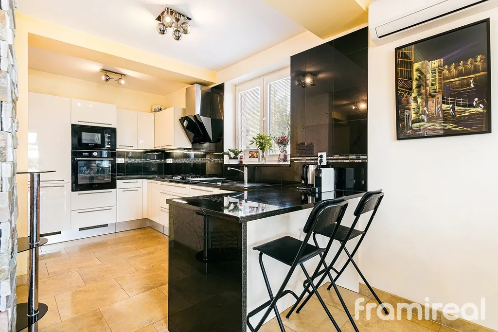 V přízemí se nachází obývací pokoj s krbem a klimatizací, propojený s kuchyňským koutem a jídelnou. Podlahové vytápění v kombinaci s mramorovou dlažbou zajišťuje příjemnou teplotu i v chladnějších dnech.