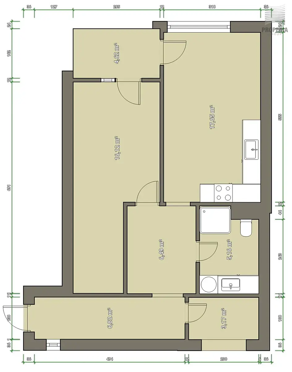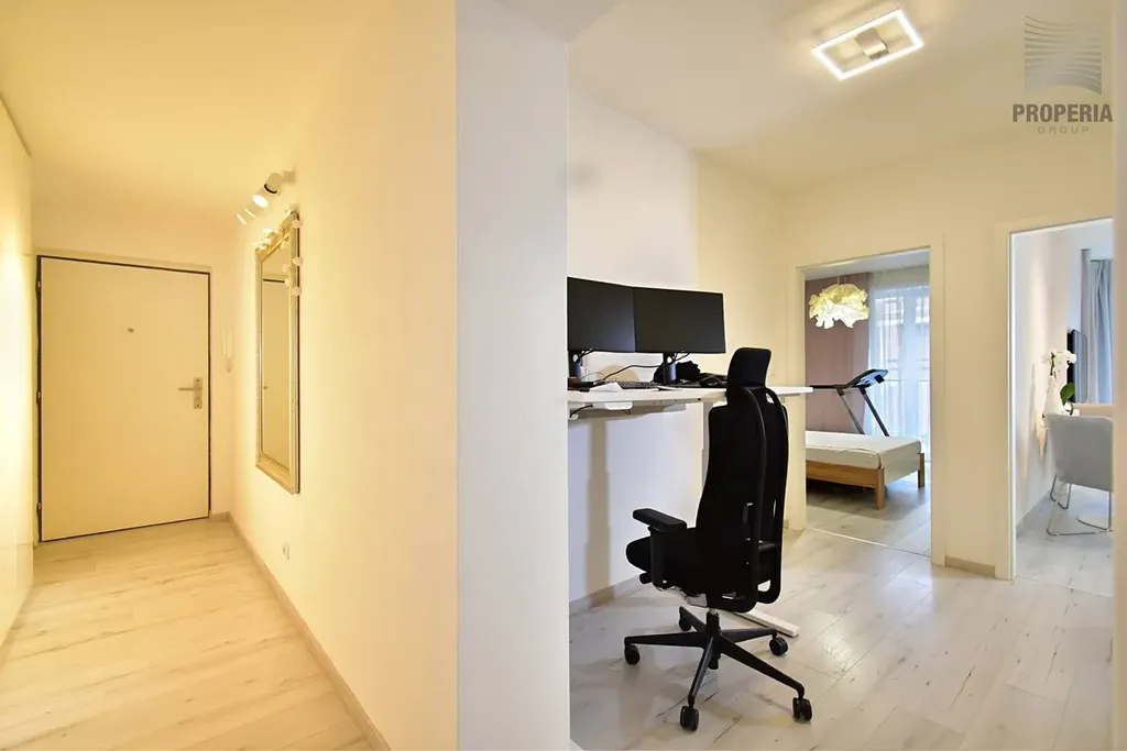 Dispozice vstupní chodba s úložným prostorem, obývací pokoj s kuchyní (vybavenou spotřebiči) a balkonem. Samostatná prostorná ložnice, šatna a v chodbě možnost pracovního koutku.