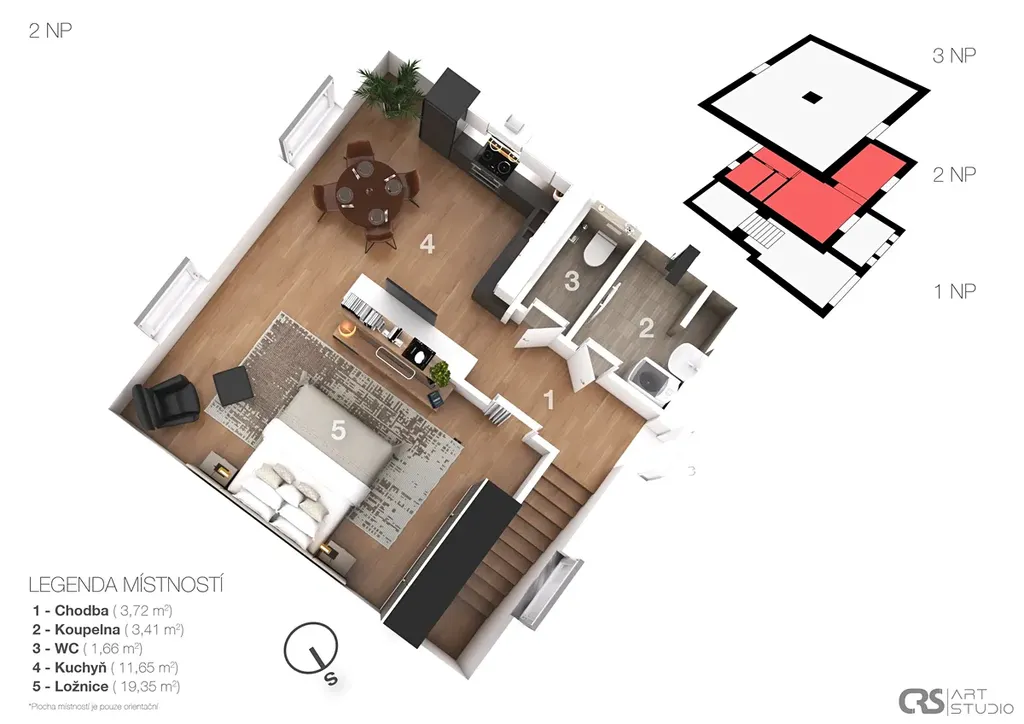 - pozor, v 3D návrhu není zohledněn skos stěn/střechy, bude opraveno. Rozložení nábytku tedy nemusí odpovídat reálným možnostem. Informace doplníme.
