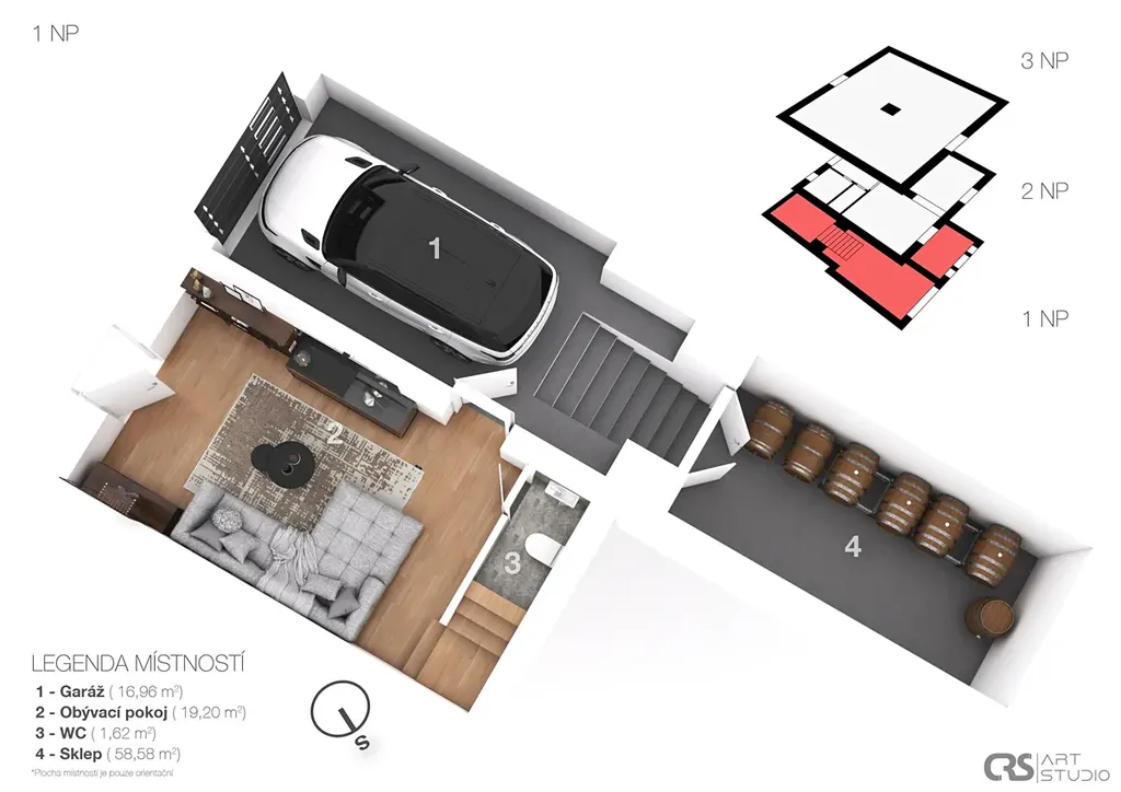 Dispozice domu je zobrazena ve 3D plánku, který je návrhem možného využití a vybavení. Doplnění k 3D zobrazení: